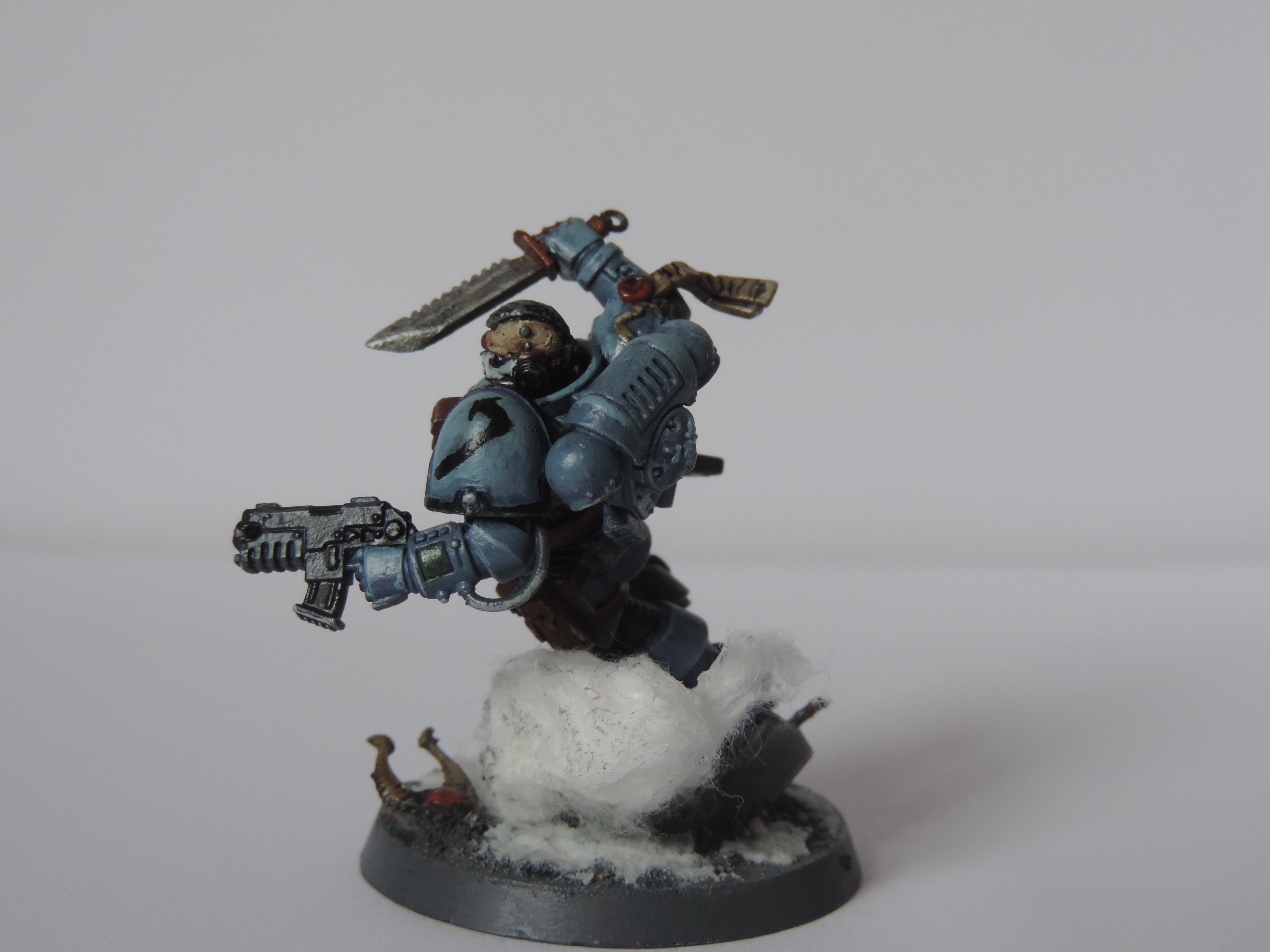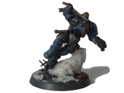 prolo qui fait qu'elle arrive tout le temps à un certain angle) Le bolter qui est pas vraiment comme j'aurais voulu, la couleur du layer que j'ai utilisé est trop orange, j'ai perdu une pièce de la figurine comme un con (holster+haut du casque), l'avant de la jambe droite qui est très peu travaillé (c'est pour ça que j'ai mis du coton pour cacher) et le coton qui a pas vraiment pris la forme que je voulais.