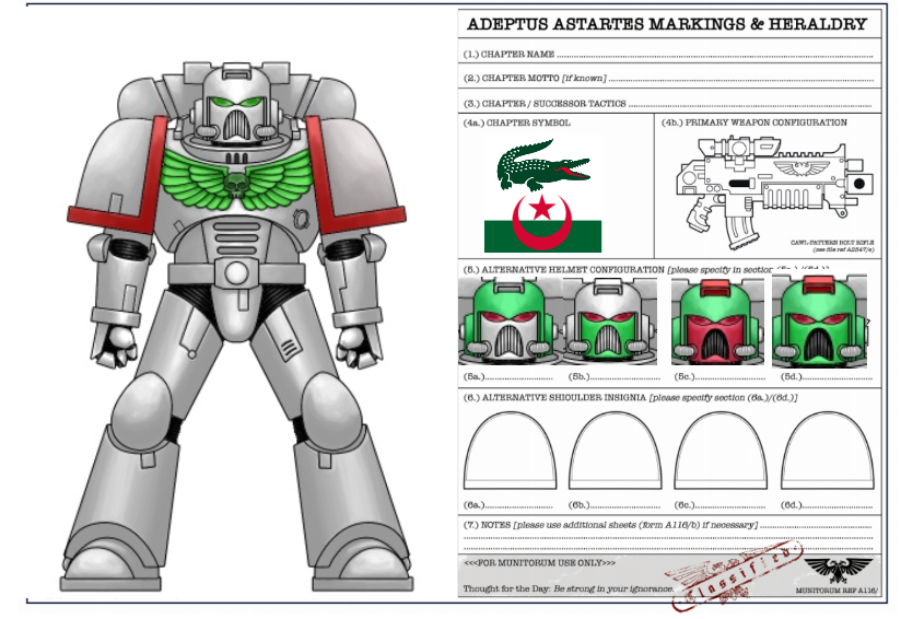 Surprisingly short compared to other astartes, the QLF have become expert of guerilla warfare and ambushes, often outnumbering their opponents. Each sergeant also carry a company standard, proudly displaying the chapter symbol, a green crocodile on top of a red moon crescent.