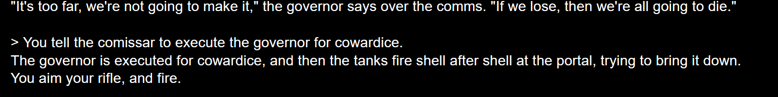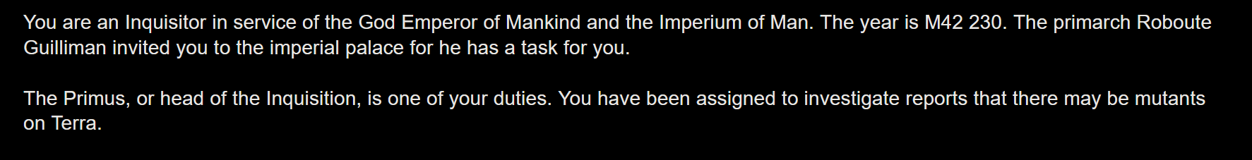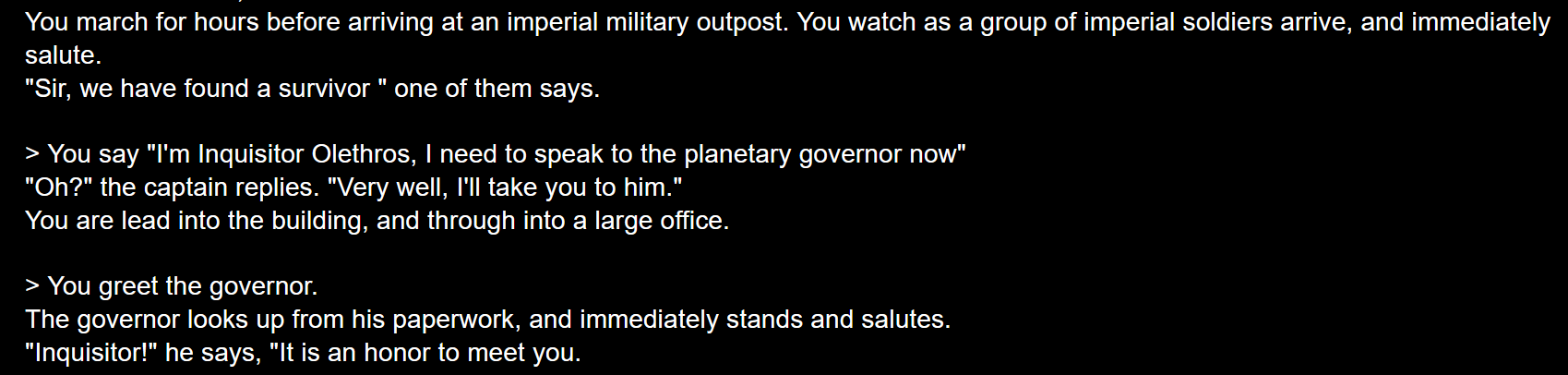 Y'a des kheys qui ont essayé AI Dungeon avec le lore de warhammer 40k? J'ai réussi à faire une histoire où j'incarne un inquisiteur psyker qui aide Kaldor Draigo à s'échapper du warp. On arrive ensuite dans une planète impériale qui se fait envahir par des démons dirigés par M'Kar
