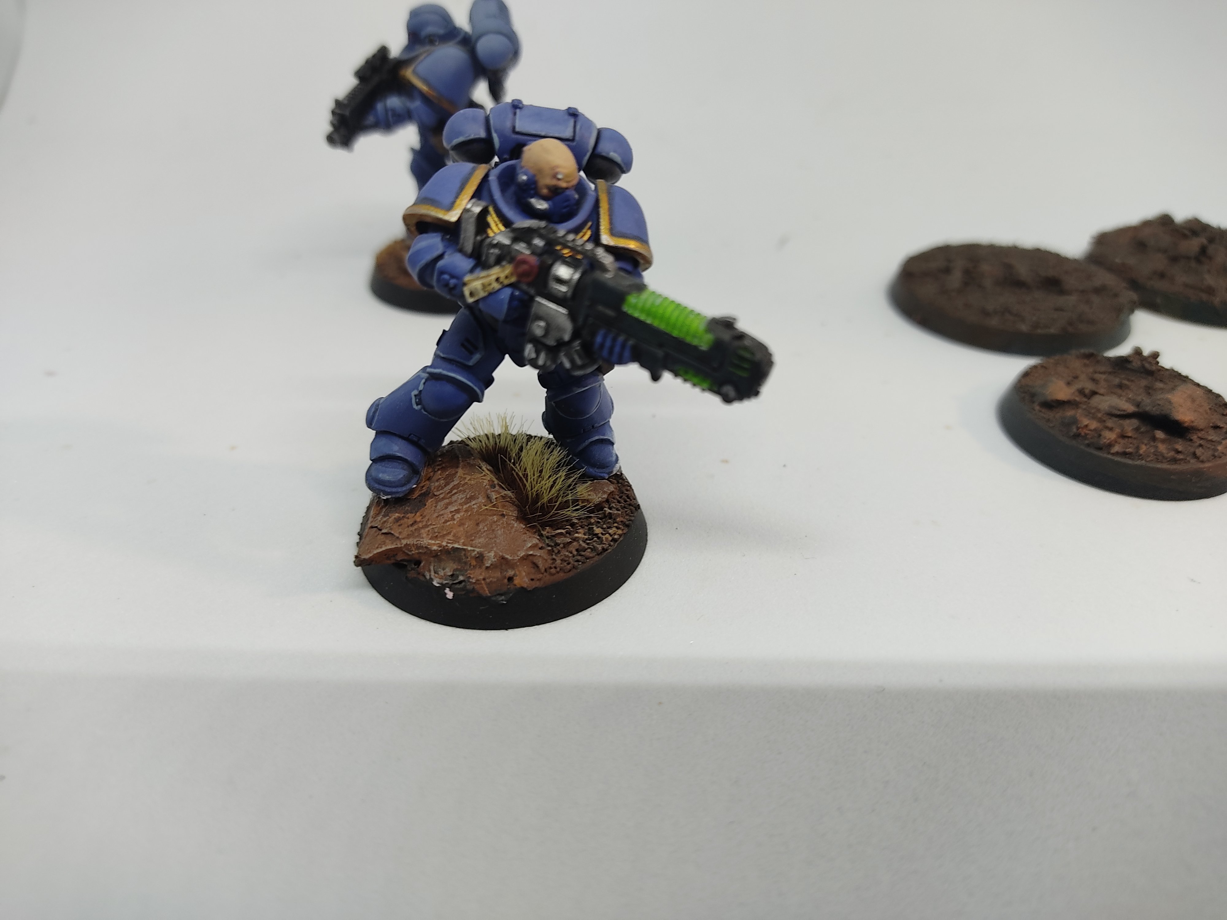 Pour mon armée ultra, j'ai fait des socles assez ternes, pour mettre en avant le bleu bien pétant des figurines.
