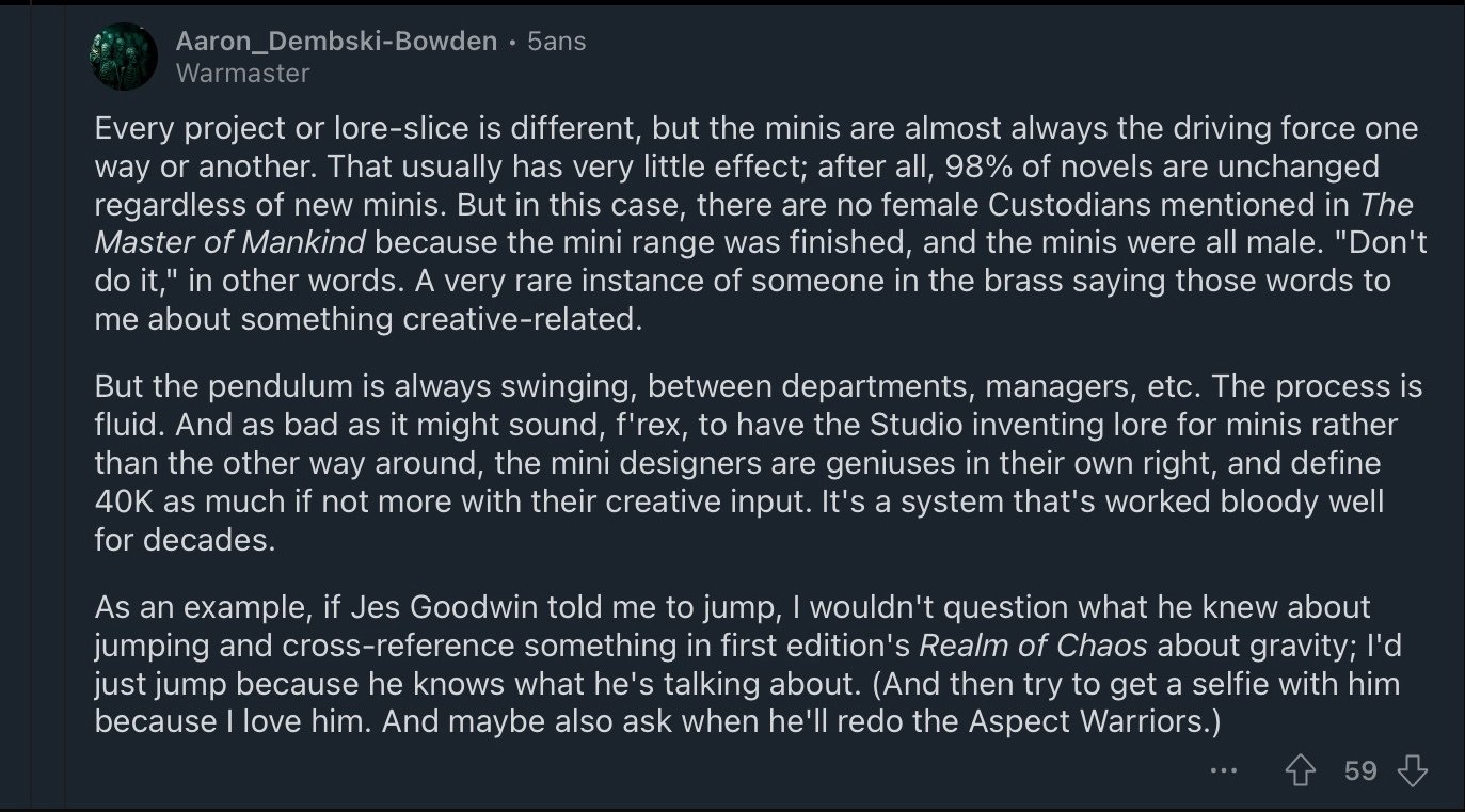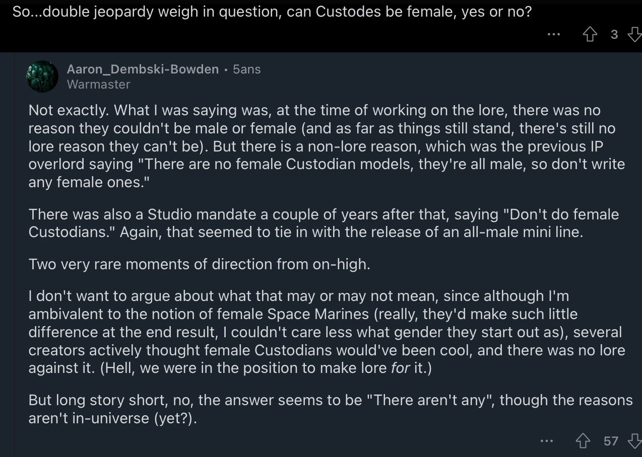 2. Je n'ai pas de doute sur le fait que pour les auteurs à l'époque de Rogue Trader / V2 de 40K, que les Custodes étaient tous des hommes. Mais il y a tout de même une différence notable avec les SM : les SM, c'était écrit noir sur blanc que seuls des hommes pouvaient en devenir. On a beau critiquer GW régulièrement, ils ont plus tendance à exploiter des petites fenêtres ouvertes il y a longtemps (pas mal de vieux concepts datant directement des années 80/90 par exemple) qu'à créer eux-mêmes des nouvelles fenêtres (les Primaris étant plus l'exception que la règle).
