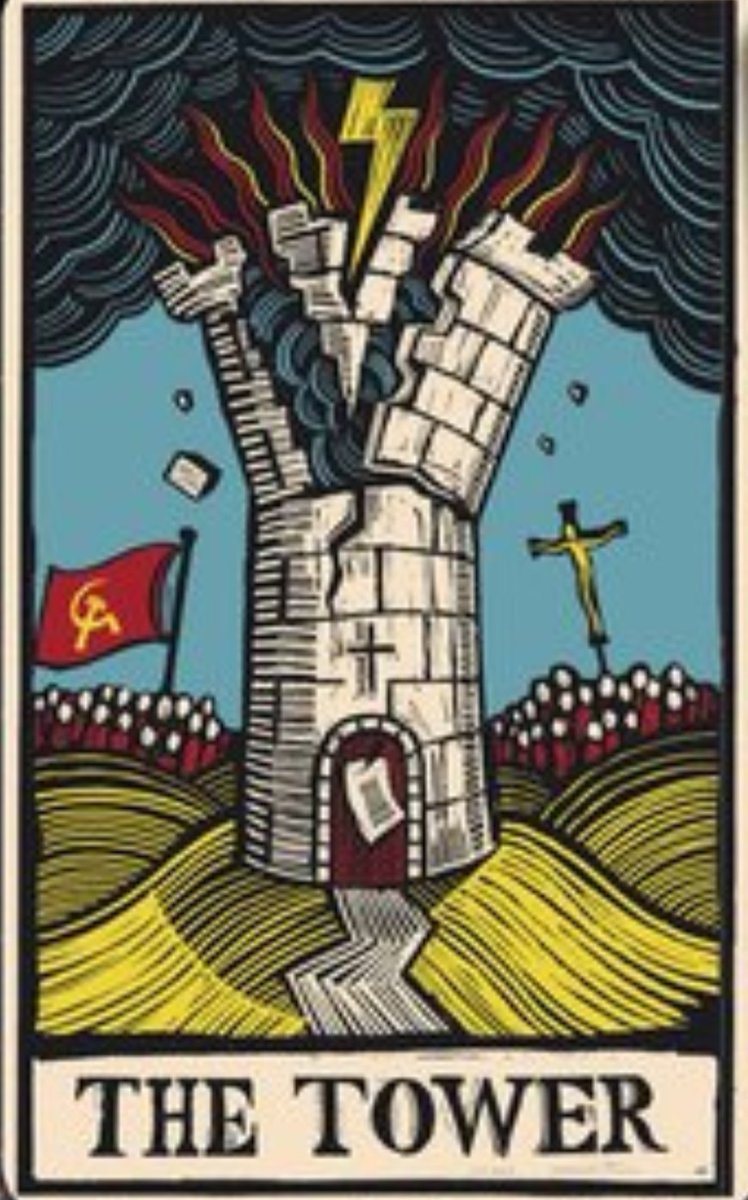 On y voit un édifice religieux en feu, avec le symbole d'un éclair en haut.