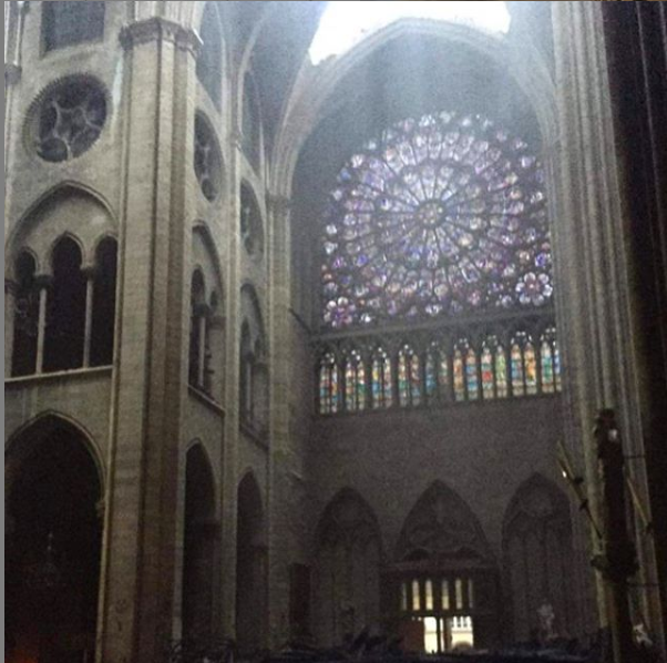 C’est l’un des points noirs, car pour le moment aucune information n’a été donnée. Elle se trouve en bas des deux tours dans l’entrée principale de la cathédrale. Il semble que le feu n’ait pas eu le temps de consommer cette partie. Cependant avec la chaleur il est possible que cela ait fait d’énormes dégâts.Les vitraux :