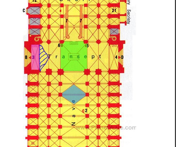En bleu, c'est ce qui est tombé suite à l'effondrement de la flèche, en vert c'est la croisée du transept qui est tombée par la suite (c'est la voûte qui était juste en dessous de la flèche), et en rose c'est la voûte adjacente au pignon nord qui est également effondréecool