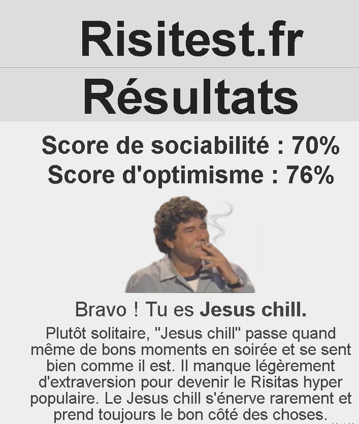 Jesus est un Risitas normal avec un côté légèrement autiste. Il accepte la plupart du temps d'aller en soirée avec ses amis, même si au fond il sait qu'il serait mieux seul chez lui à geeker. Il écoute de la deep house dans son casque Marshall et passe des soirées à troll sur JVC et discute parfois sur les topics de blabla.