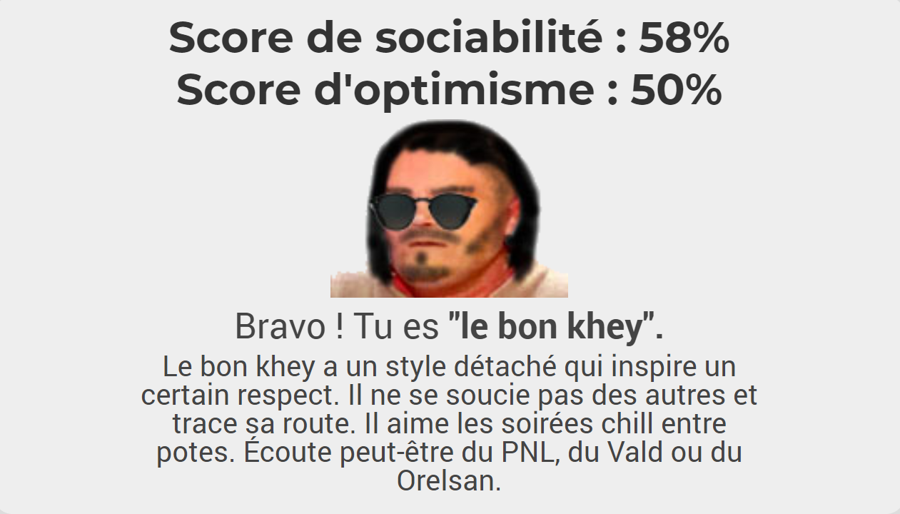 Le bon khey a un style détaché qui inspire un certain respect. Il ne se soucie pas des autres et trace sa route. Il aime les soirées chill entre potes. Écoute peut-être du PNL, du Vald ou du Orelsan.