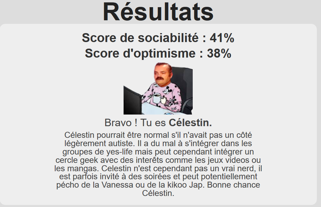 Célestin pourrait être normal s'il n'avait pas un côté légèrement autiste. Il a du mal à s'intégrer dans les groupes de yes-life mais peut cependant intégrer un cercle geek avec des interêts comme les jeux videos ou les mangas. Celestin n'est cependant pas un vrai nerd, il est parfois invité à des soirées et peut potentiellement pécho de la Vanessa ou de la kikoo Jap. Bonne chance Célestin.