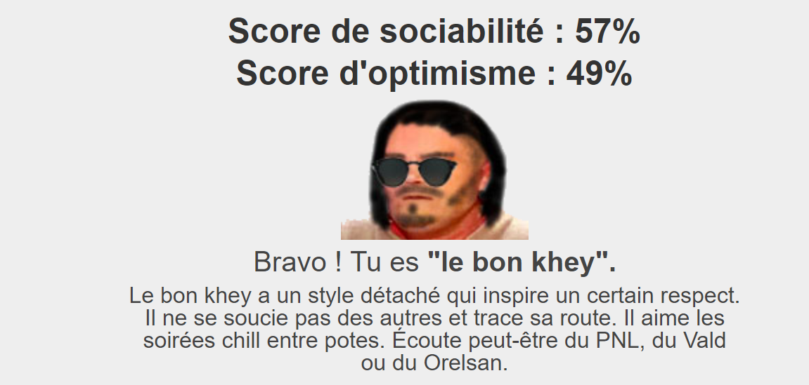 64% de sociabilité, 67% d'optimisme alors que pourtant, je suis pas ultra sociable