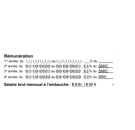 Yo les khey,j'ai signé mon contrat et c'est indiqué : "Rémunération : 65% du SMIC" , "Salaire brut a l'embauche : 846,68€"