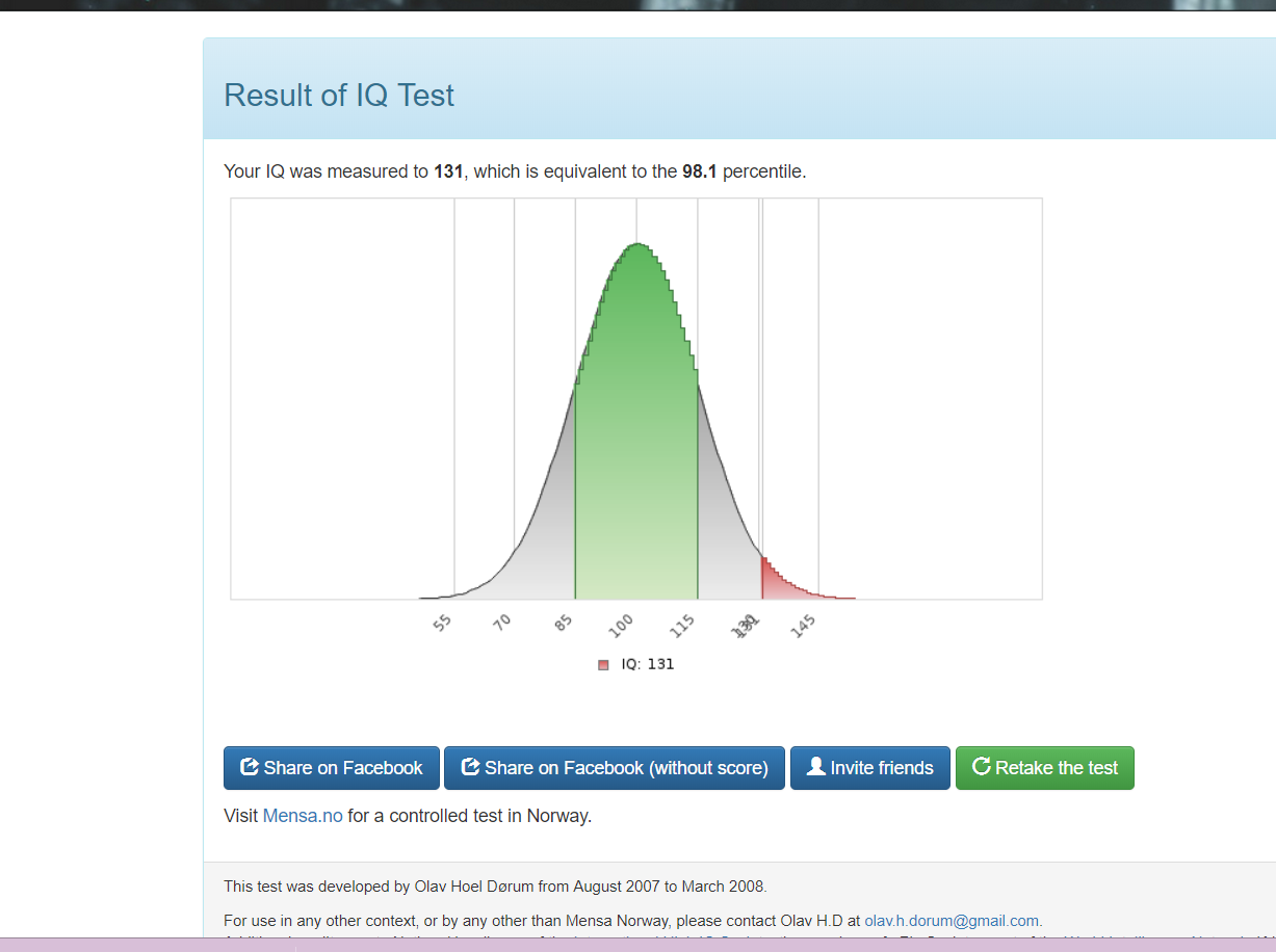 Ce genre de test est construit sur un schéma relativement foireux. En gros pour construire un test similaire, tu prendrais des personnes avec des qi différemment mais réellement testé, un de 150, un de 160 un de 140, un de 130 etc Tu les fais passer ton test. Puis avec leur réponses tu établis une grille en quelques scores. Les gens qui derrière passeront le test, ils auront un résultat en fonction de leur réponses, et de qui a répondu de la même manière dans l'échantillon test qu'à utiliser le site.