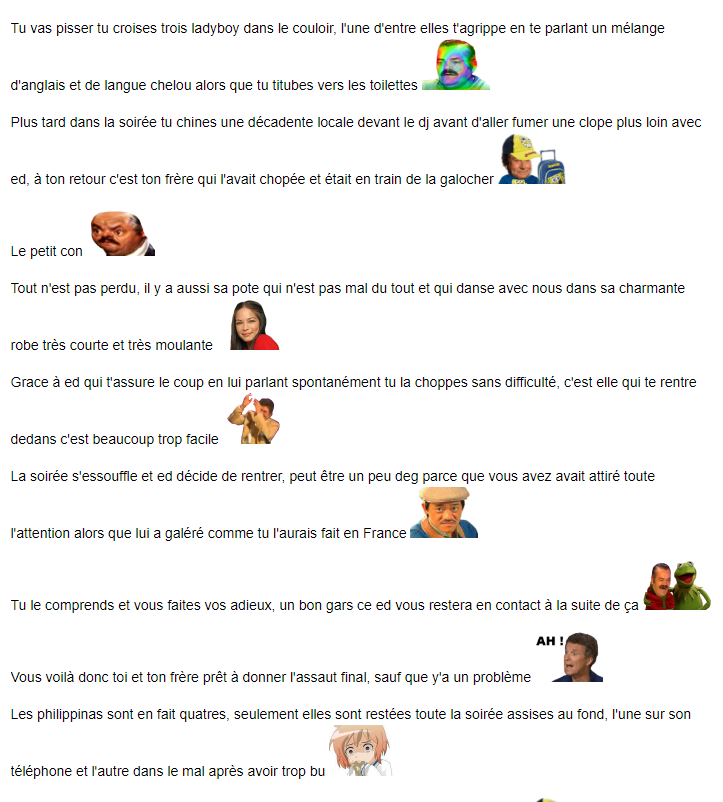 Blague à part j'espère que ça ira mieux au fur et à mesure que le topic grossi, j'aime bien raconter mon histoire mais ça prend du temps et c'est pas super motivant de voir son gros pavé bider