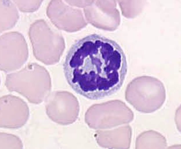 J imagine un polynucléaires neutrophiles, car il est le seule à être comme ça sur l image, +gros noyaux désordonné. Dur d etre sure avec juste cette image, t as pas d autre detaille?