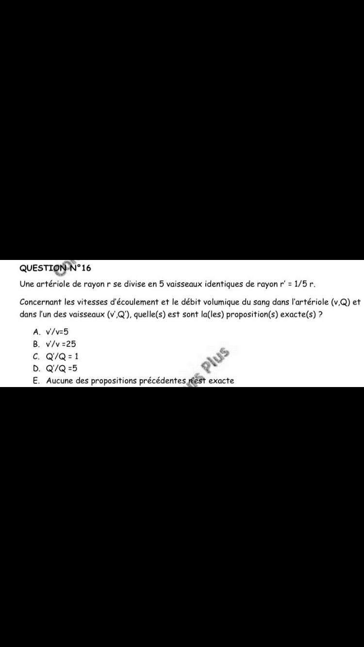 A mon avis c'est parce que Q' c'est le débit dans un seul des vaisseaux, donc du coup que Q = 5*Q', et ça a du sens avec l'item A qui est vrai, fin quand je réduis tout, je me retrouve à V1=V2/5 donc V2/V1 = 5