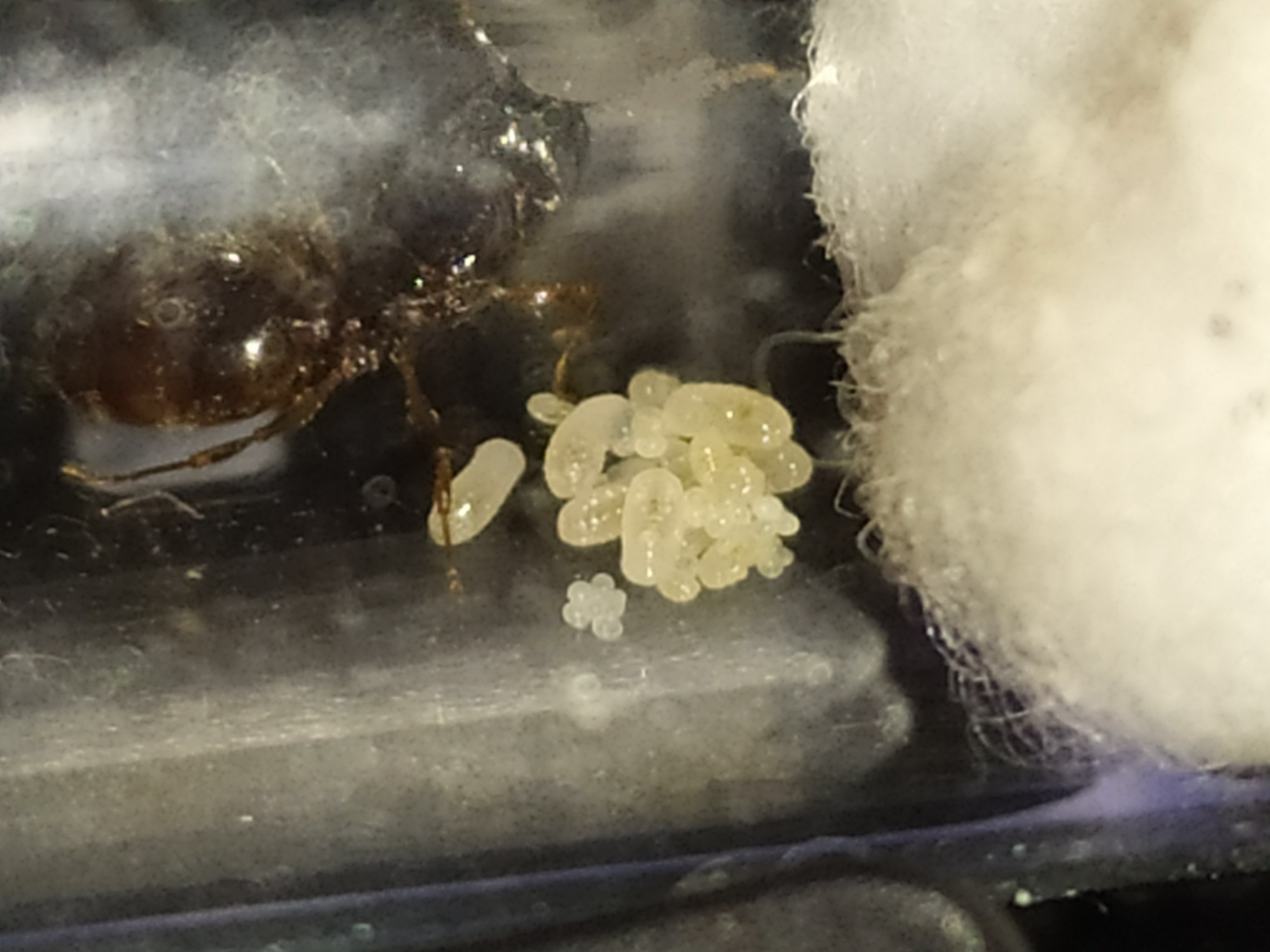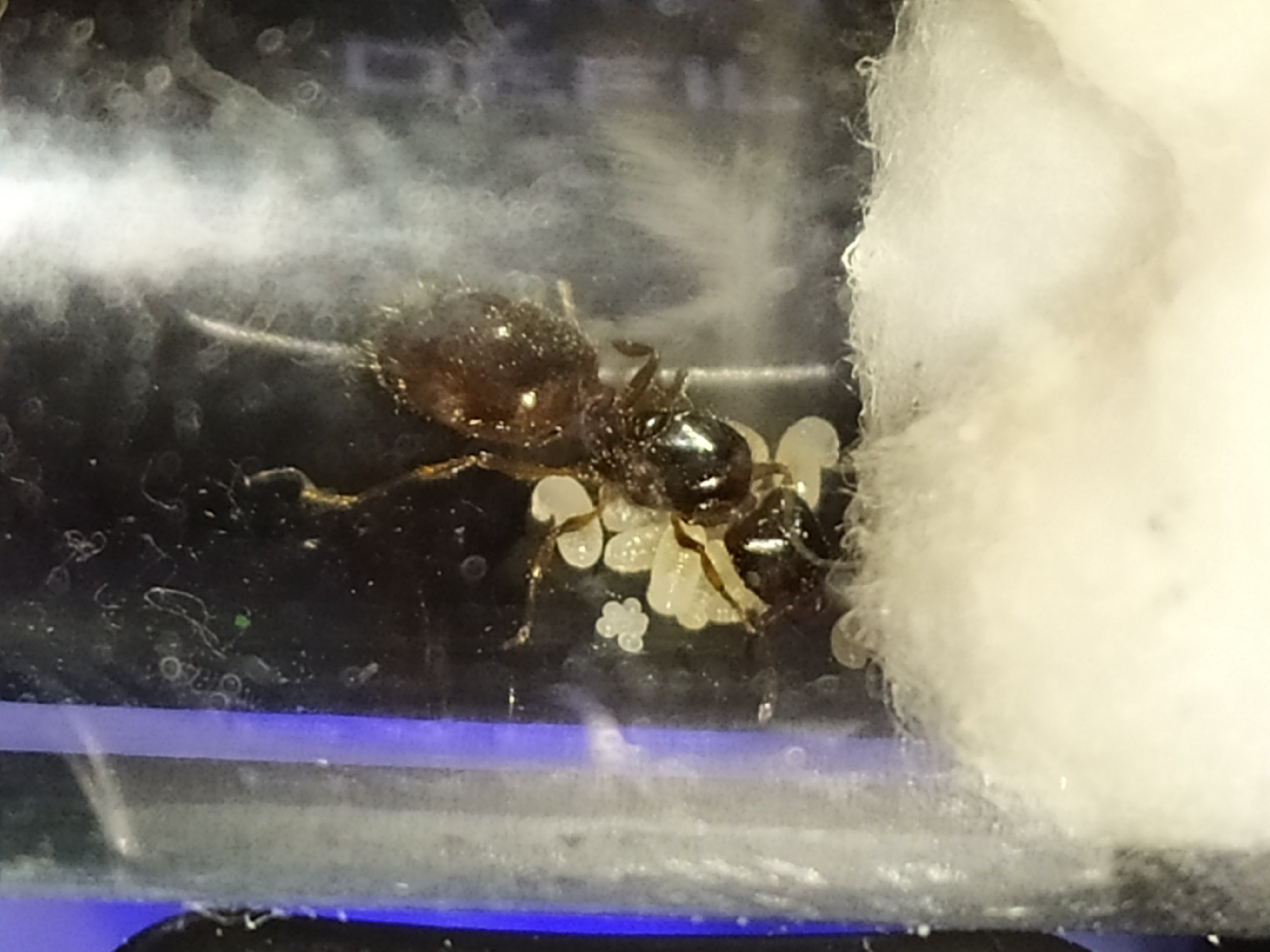aucune idée au vu de la forme du thorax une pheidole je dirai mais ça corresponds pas à sa couleur donc j'en sais rien mais elle ponds 3/4 oeufs tout les jours même en la tripotant pour prendre des photo et des vidéo xD