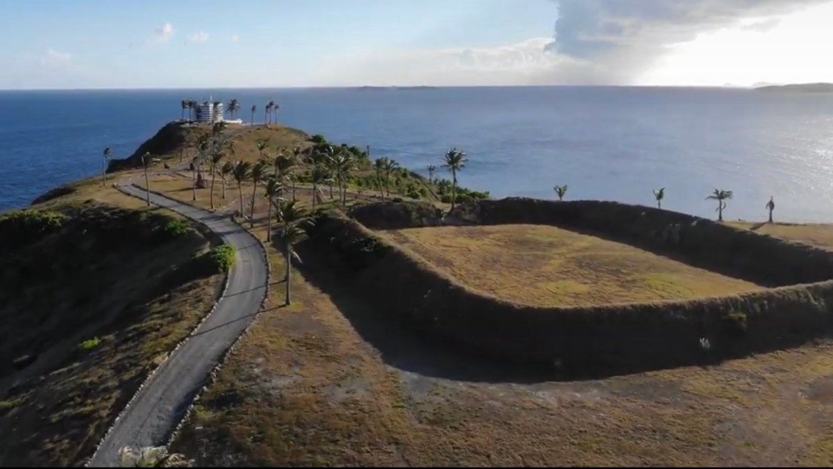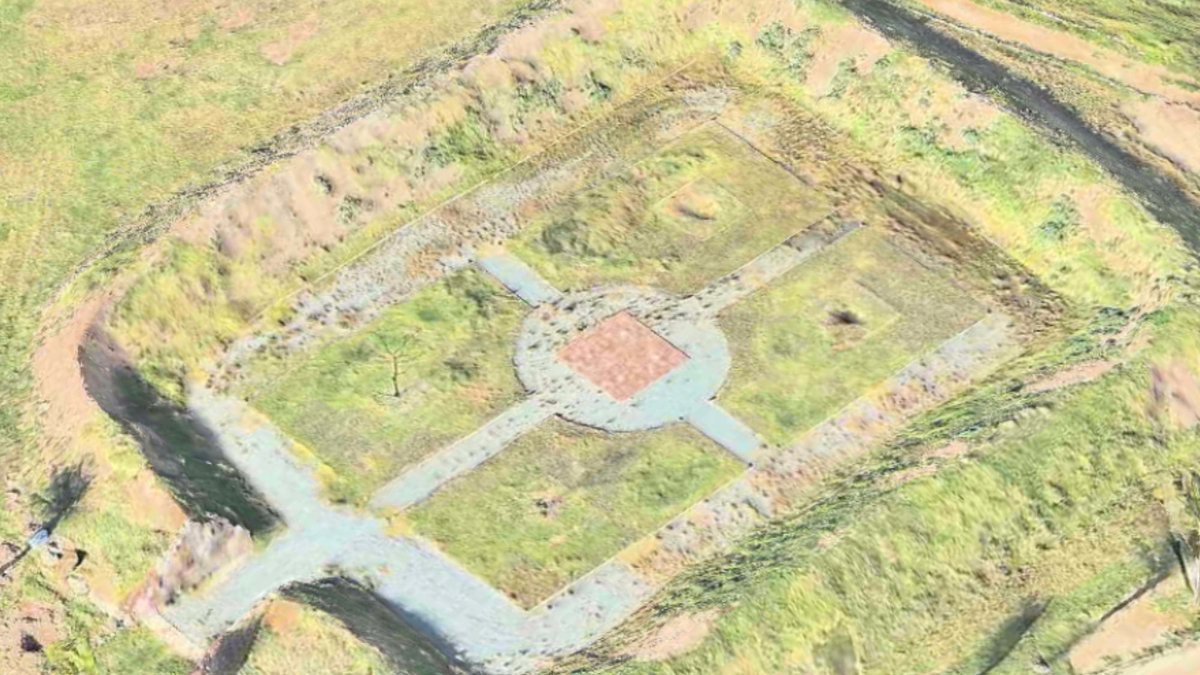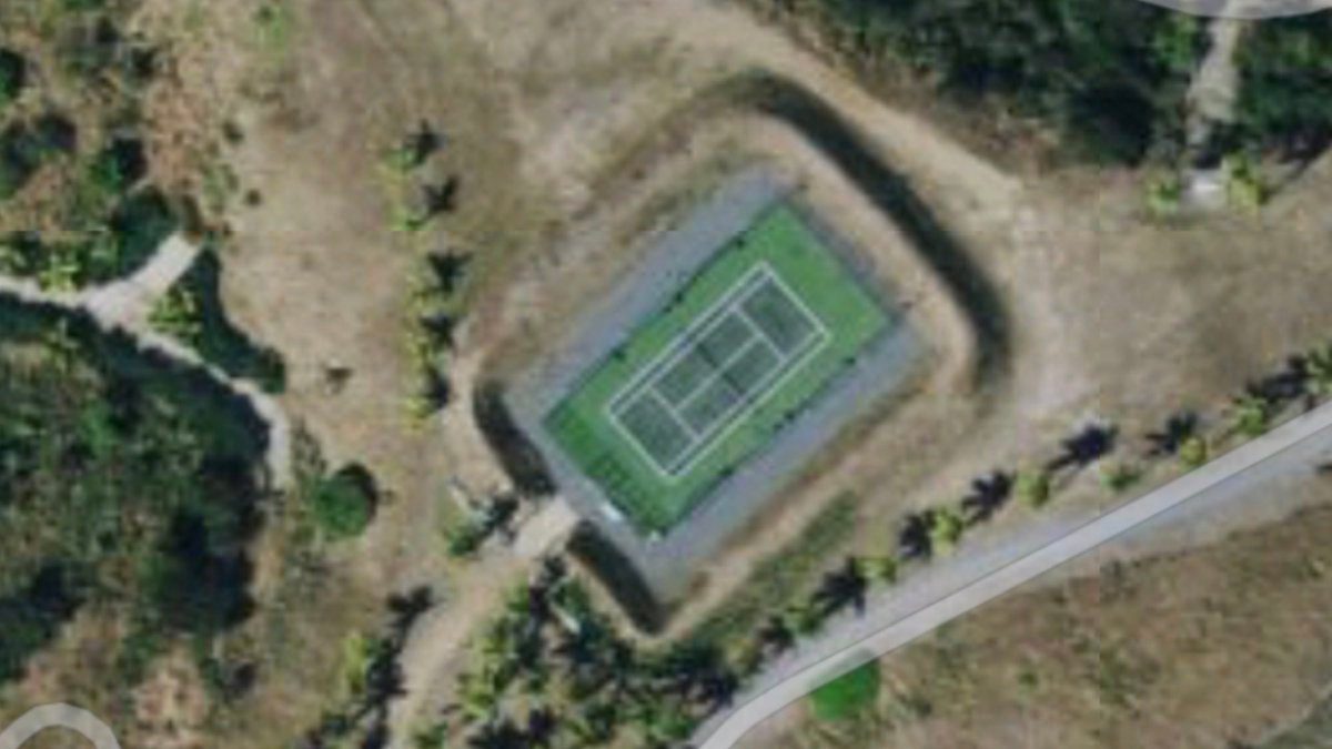 9) À côté du cadran solaire se trouvait un rectangle entouré de monticules recouverts d'une bâche peinte à la manière d'un court de tennis pour tromper Google Earth.