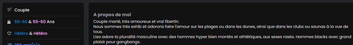 Et j'en ai encore des dizaines d'autres des comme ça, mais bon vous avez saisi l'idée de pourquoi je ne baise pas avec ces sites, c'est pourquoi j'ai stoppé tous mes abonnements (+ de 600€ jetés à la Loire avec Tinder et les sites libertin en 3 ans pour au final rester puceau)...Sachez donc qu'il est quasiment impossible d'intéresser les couples sur ces sites...