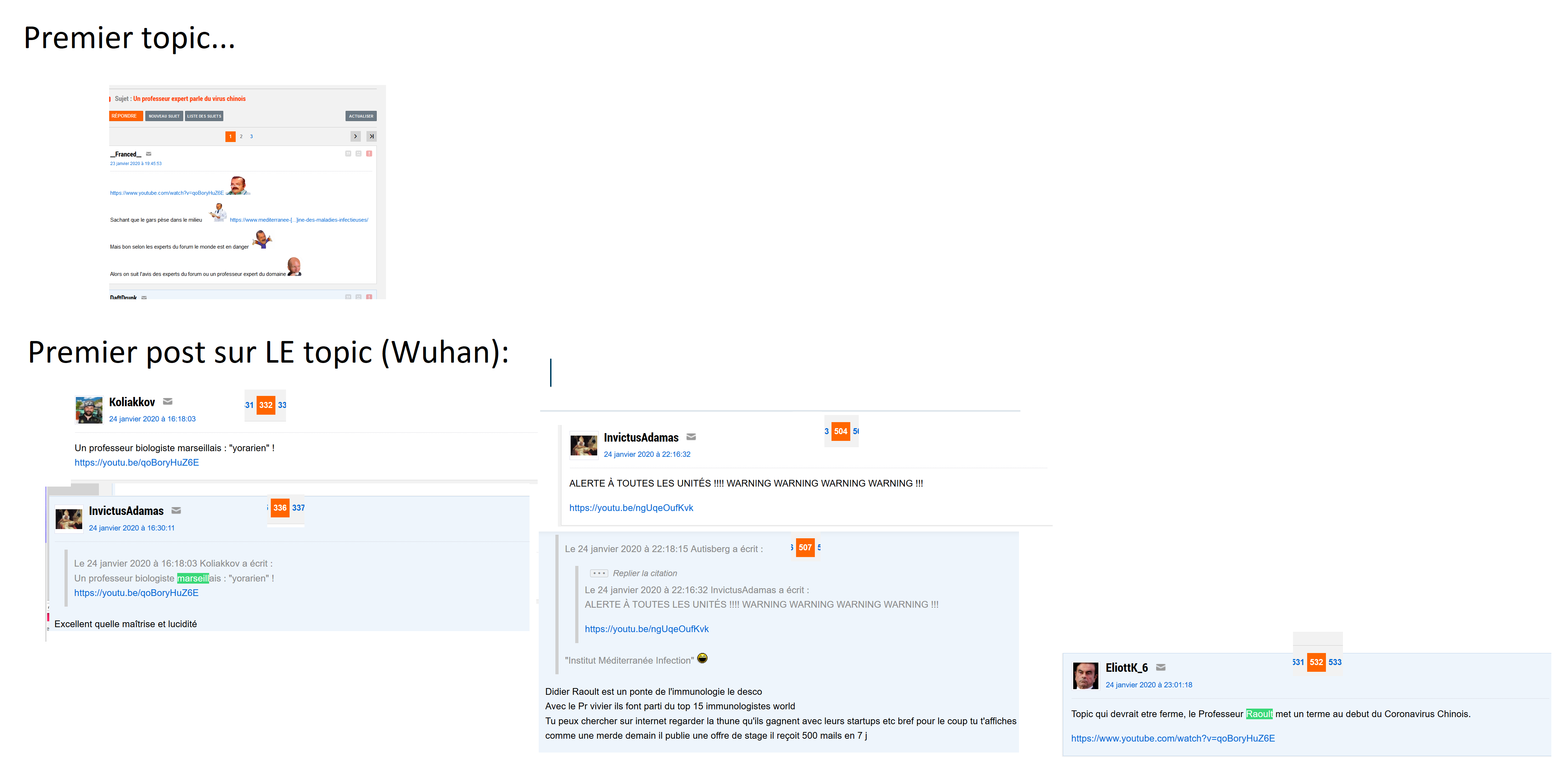 https://www.lemonde.fr/pixels/article/2020/03/27/de-yorarien-a-yakekchose-didier-raoult-figure-des-forums-de-jeuxvideo-com_6034716_4408996.html Bravo l'auteur. Hélas, ce soir-là personne n'avait vu ce topic.Heureusement que le lendemain j'étais tombé moi aussi sur cette video, et je l'ai immédiatement partagée à différents endroits, dont sur le topic Wuhan