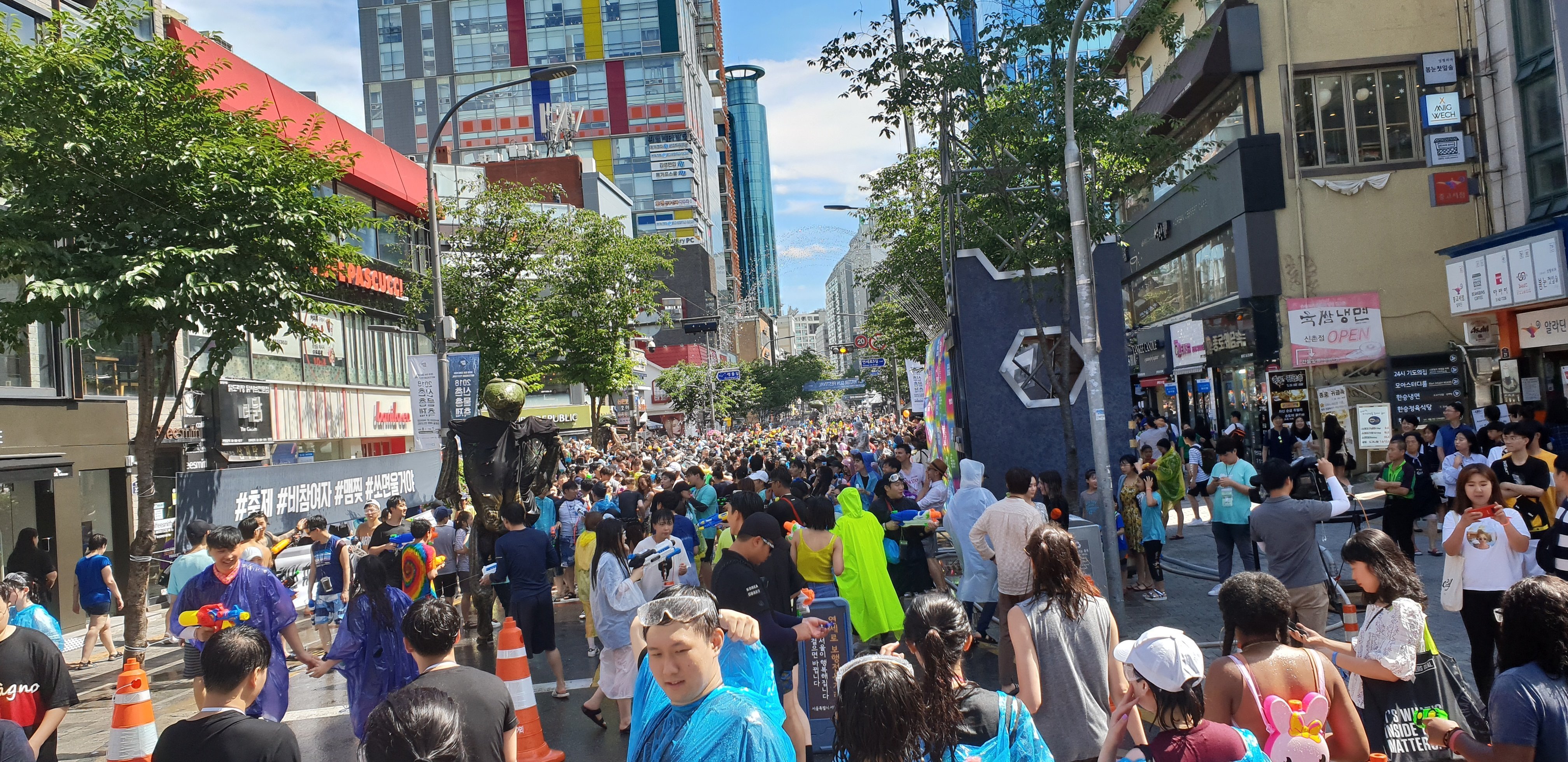 Sur le chemin je remarque qu’il y a énormément de monde, mouillé, certains en maillot de bain, en pleine rue, avec des pistolets à eau, de la musique à fond