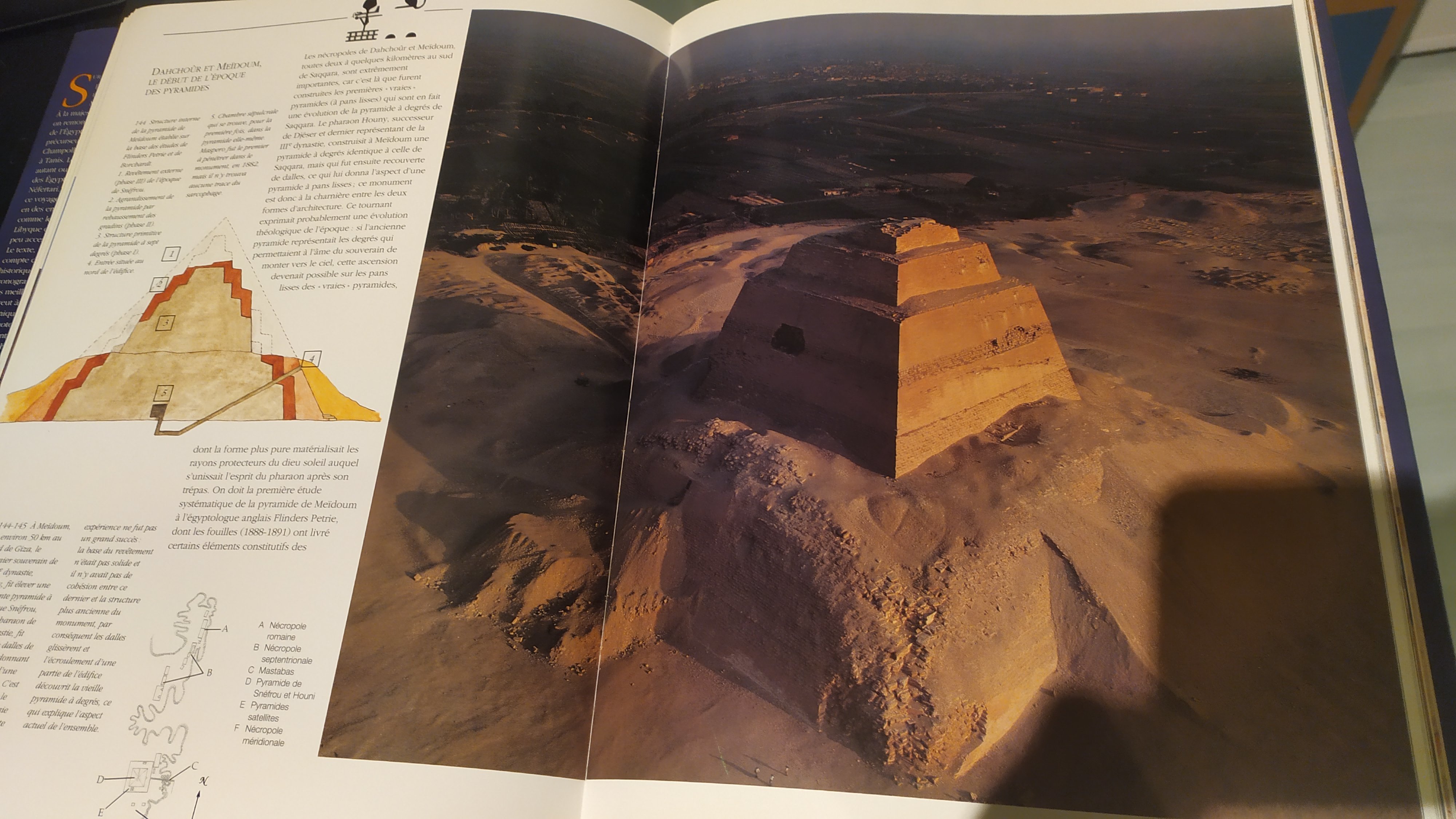 Je crois que j'ai plusieurs vu passer le titre de ce livre, mais je l'ai jamais lu. On devine, rien qu'à la page du Meïdoum, que c'est un peu vieux. L'hypothèse d'un double constructeur, Houni puis Snéfrou, est un pur postulat qui n'est pas cohérent avec le site. Le nom d'Houni n'apparaît absolument pas sur le site, même sur les stèles (vierges) près de la face Est. Je pense pas qu'Houni y ait foutu les pieds. De même, la pyramide de Meïdoum (Djed-Snéfrou pour les puristes) n'est pas une copie de celle de Djéser. Celle de Djéser a des glacis entre les degrés, ce que n'a pas Meïdoum, tout comme celle de Djéser a un puits, tandis que la pyramide de Meïdoum signe la victoire de la descendrie sur le puits dans l'architecture des pyramides.