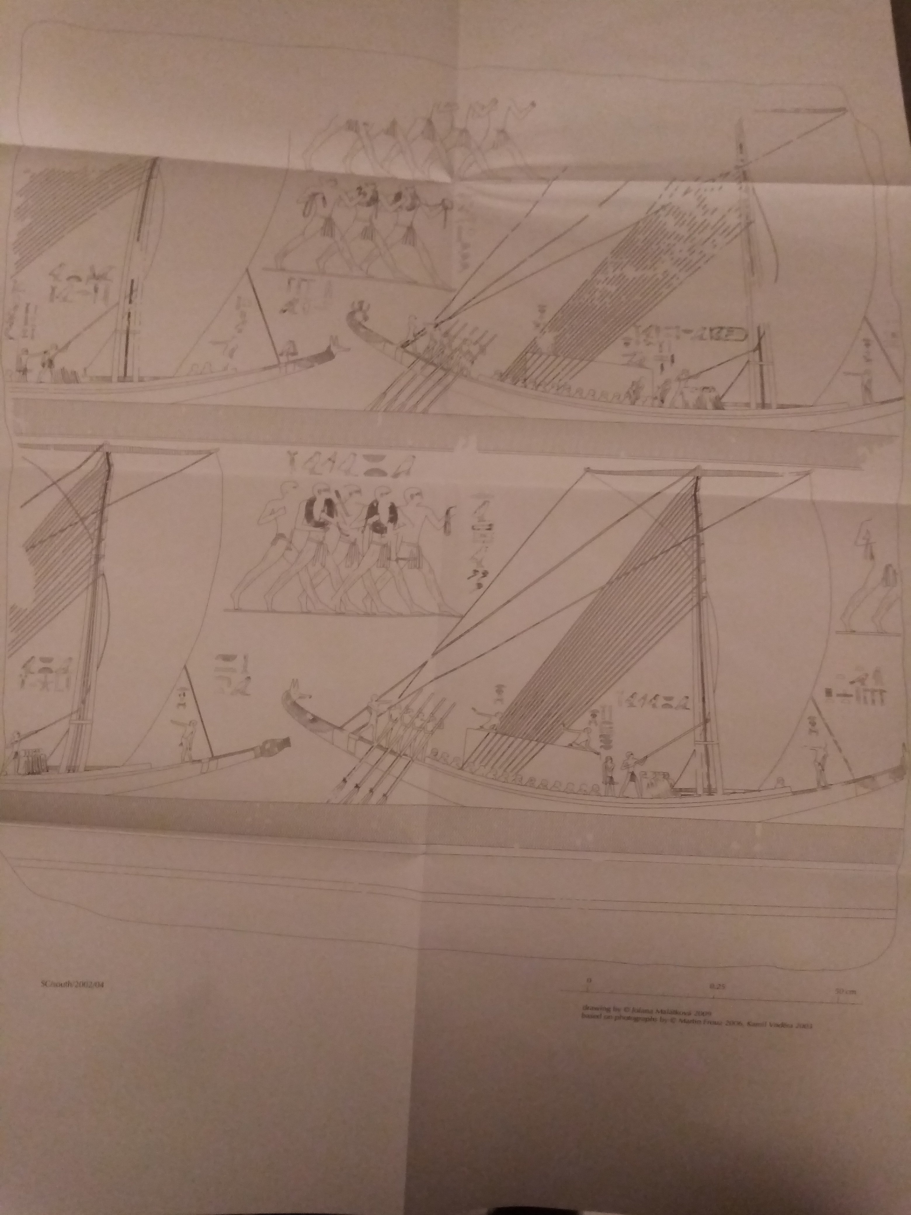 Quelques reliefs montrant de gigantesques bateaux venant de la chaussée du complexe funéraire de Sahourê.
