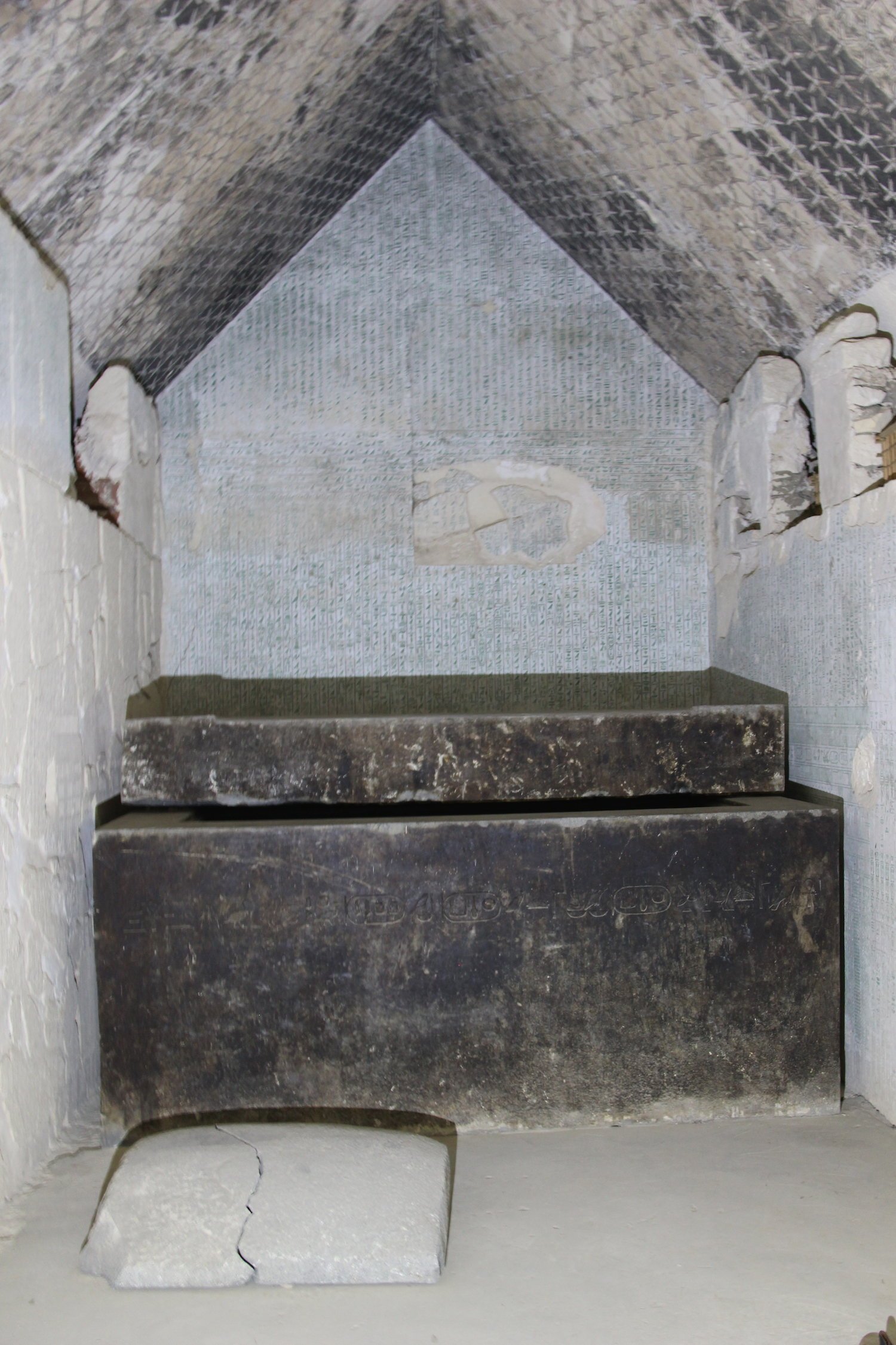 Chambre funéraire de Pepy II, vue à l'ouest sur le sarcophage. On devine les textes gravés sur le sarcophage et le couvercle de la cuve à canopes en granite sur le sol, près du mur sud. La voûte en chevron est peinte comme d'habitude à cette époque là.