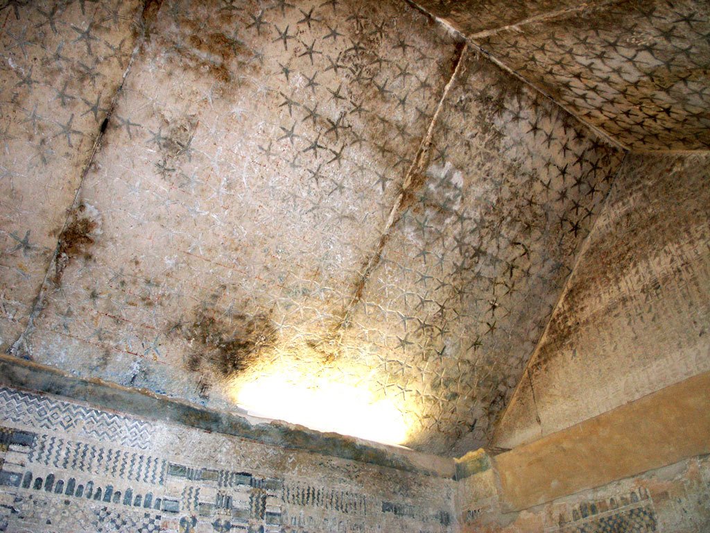 Plafond sculpté et peint de la chambre funéraire de la pyramide d'ounas. Les étoiles sont orientées vers le zénith, le haut de la pièce. Les étoiles ont cinq et, à l'époque d'ounas, sont rarissimes dans les tombes royales. A part dans les appartements funéraires de Djoser (et encore j'en suis pas sûr), aucun appartement funéraire n'en possède. Après Ounas, les rois continueront et même les reines y auront droit. Ça restera pendant des millénaires une décoration classiques des tombes royales (mais pas que, on en retrouvait déjà dans les temples dédiés au roi avant Ounas), dès les premières tombes de la vallée des Rois, les tombes ont déjà ce motif.