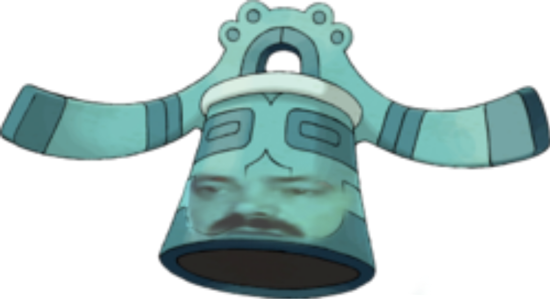 Vous avancez le long du couloir en évitant les plaques sur le sol et finissez par arriver dans un cul de sac avec une statue en métal semblant représenter un pokemon en son centre. Des représentations du pokémon de la statue sont faites sur les murs au fur et à mesure que vous regardez vous remarquez une sorte de pattern avec des représentations qui ont les yeux remplacé par des joyaux rouges.