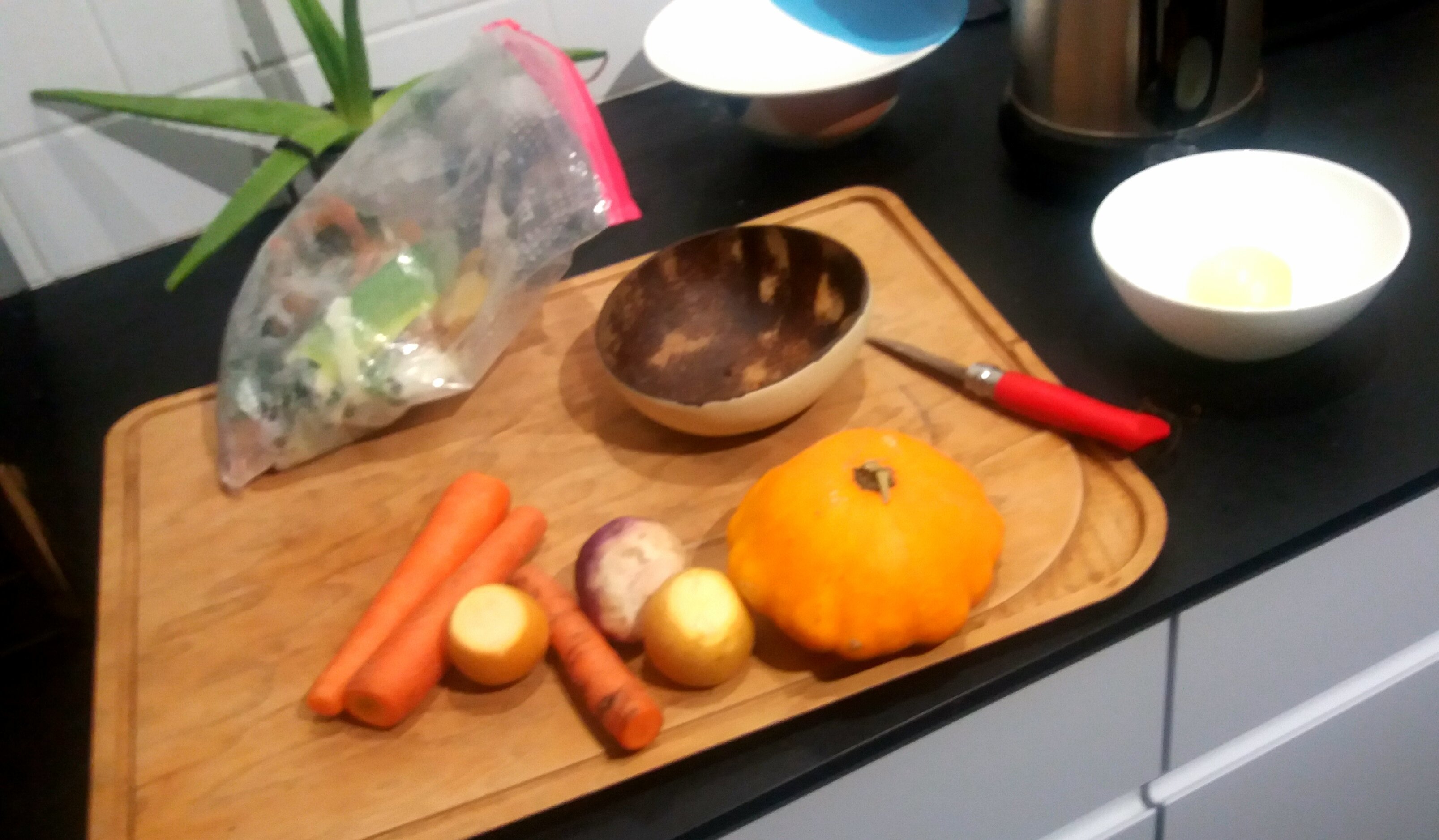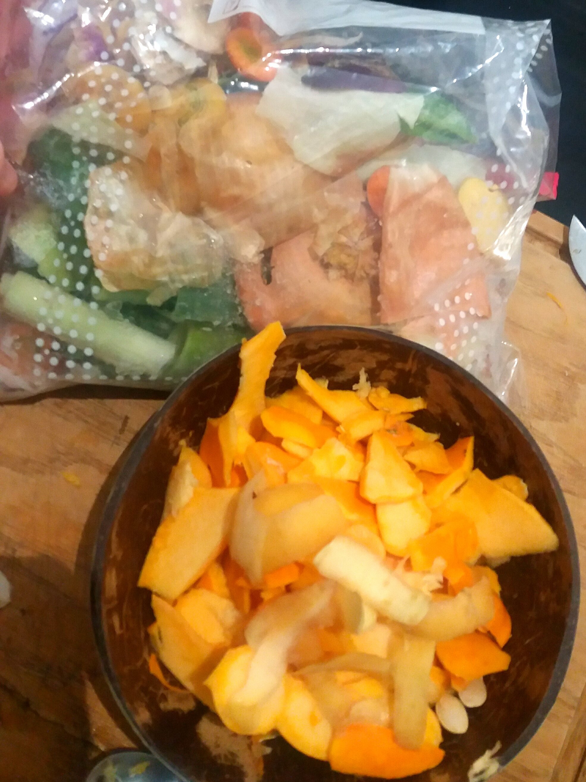 Dans le sachet les epluchures de légumes pour faire un bouillon que je garde au congele et dans le bol les epluchures que je donne à mes lombrics pour du compost.