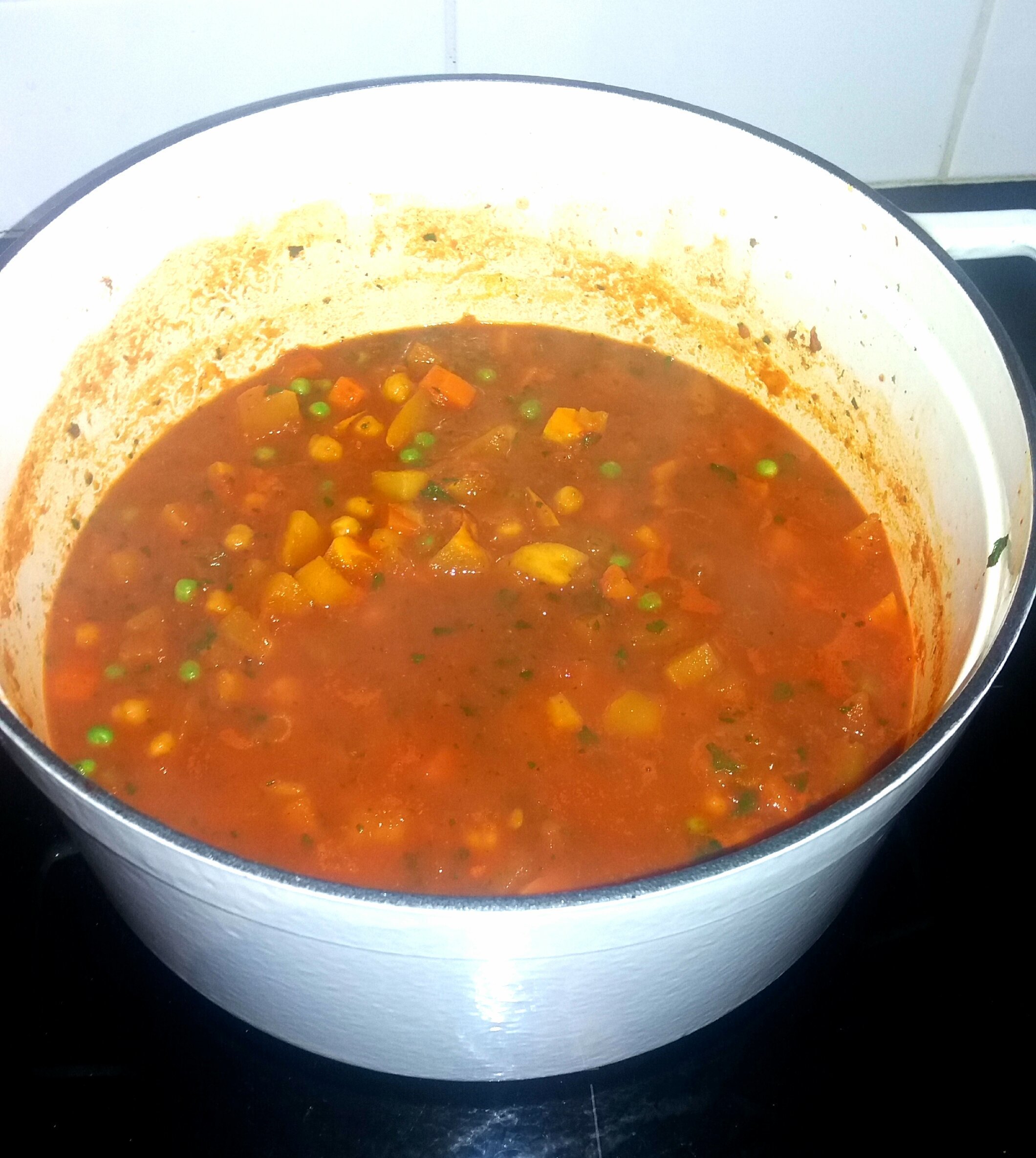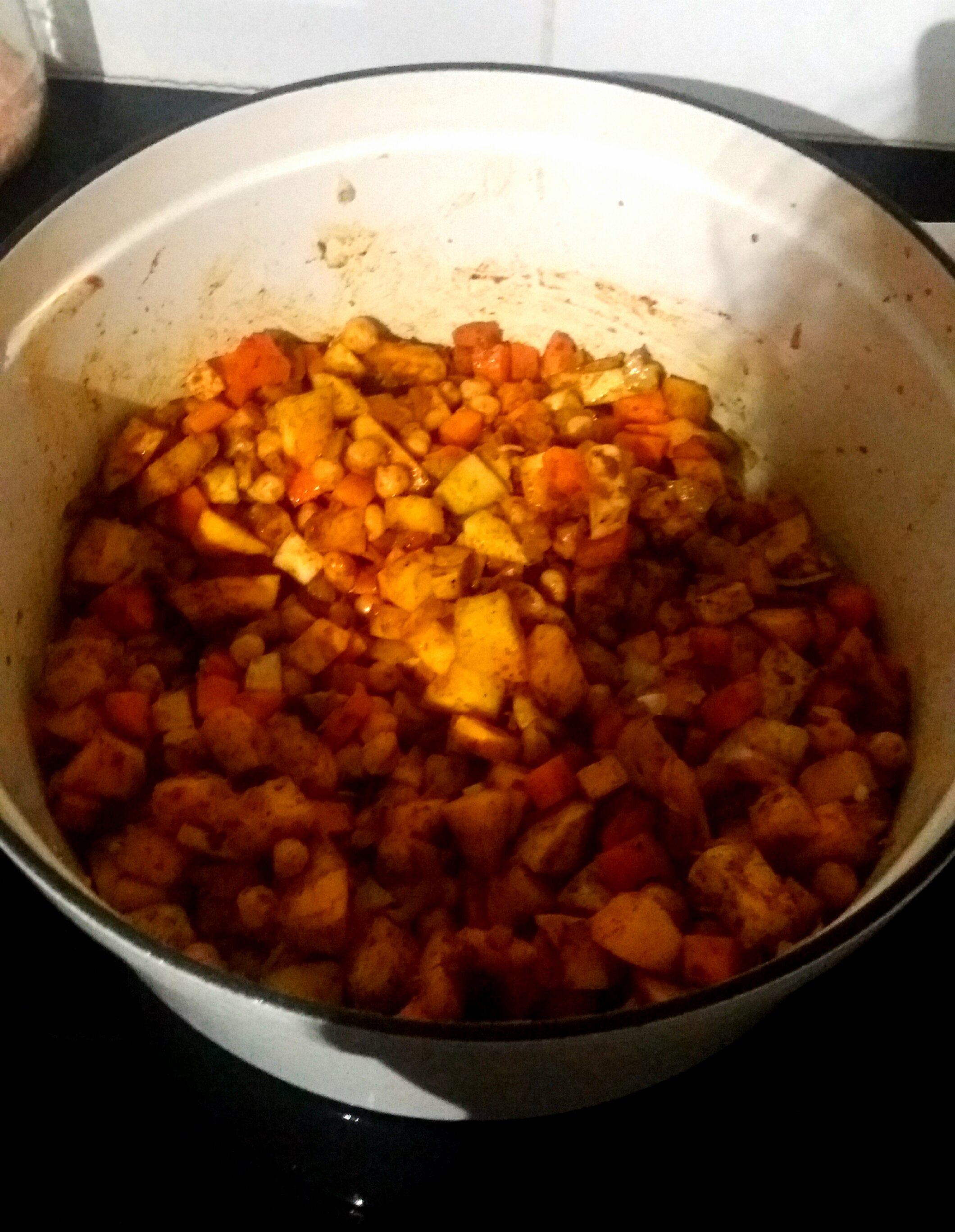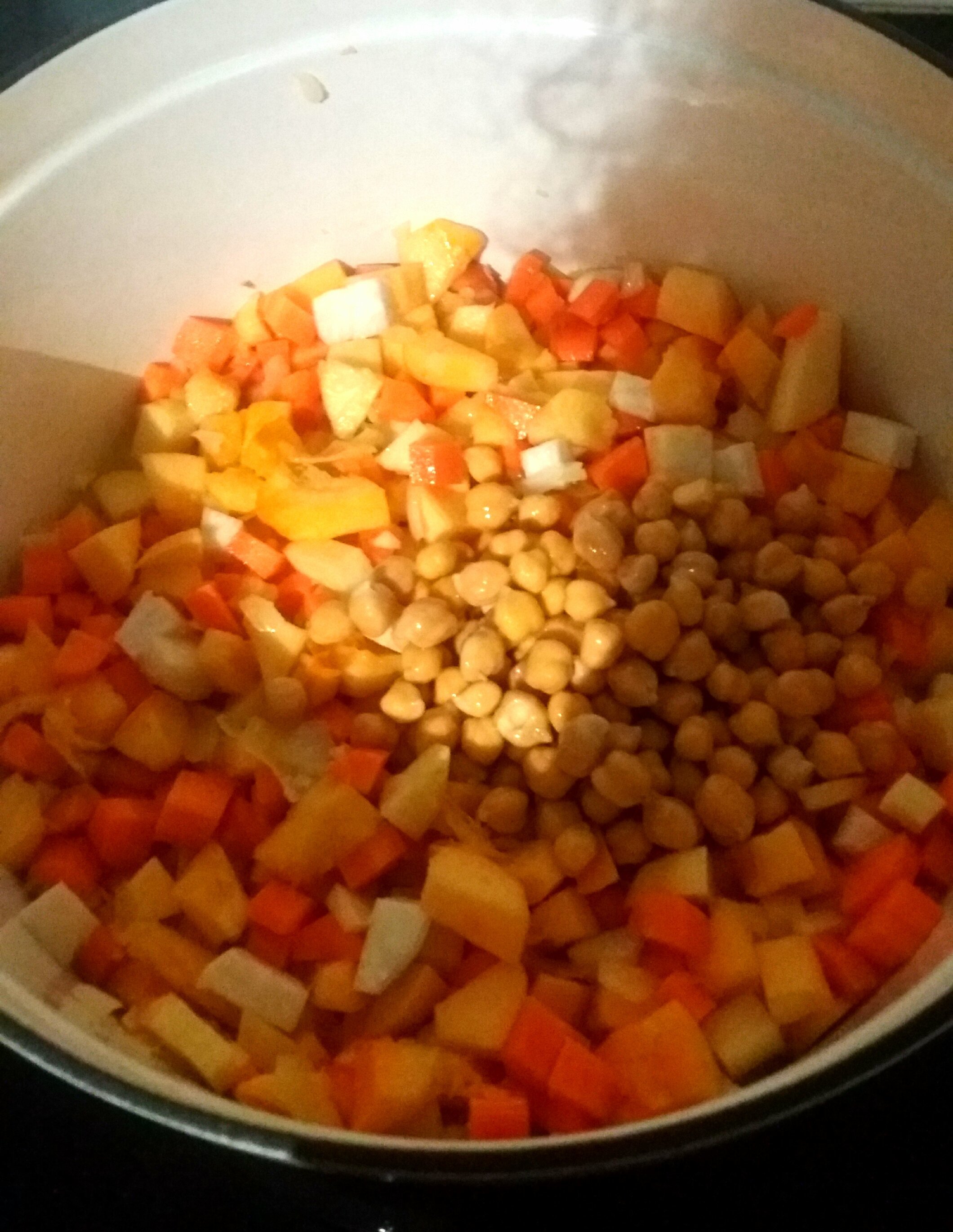 Tu fais chauffer l'huile àfeu moyen dans une cocotte pour faire fondre rapidement ail et oignon puis tu ajoutes les légumes puis les pois chiches