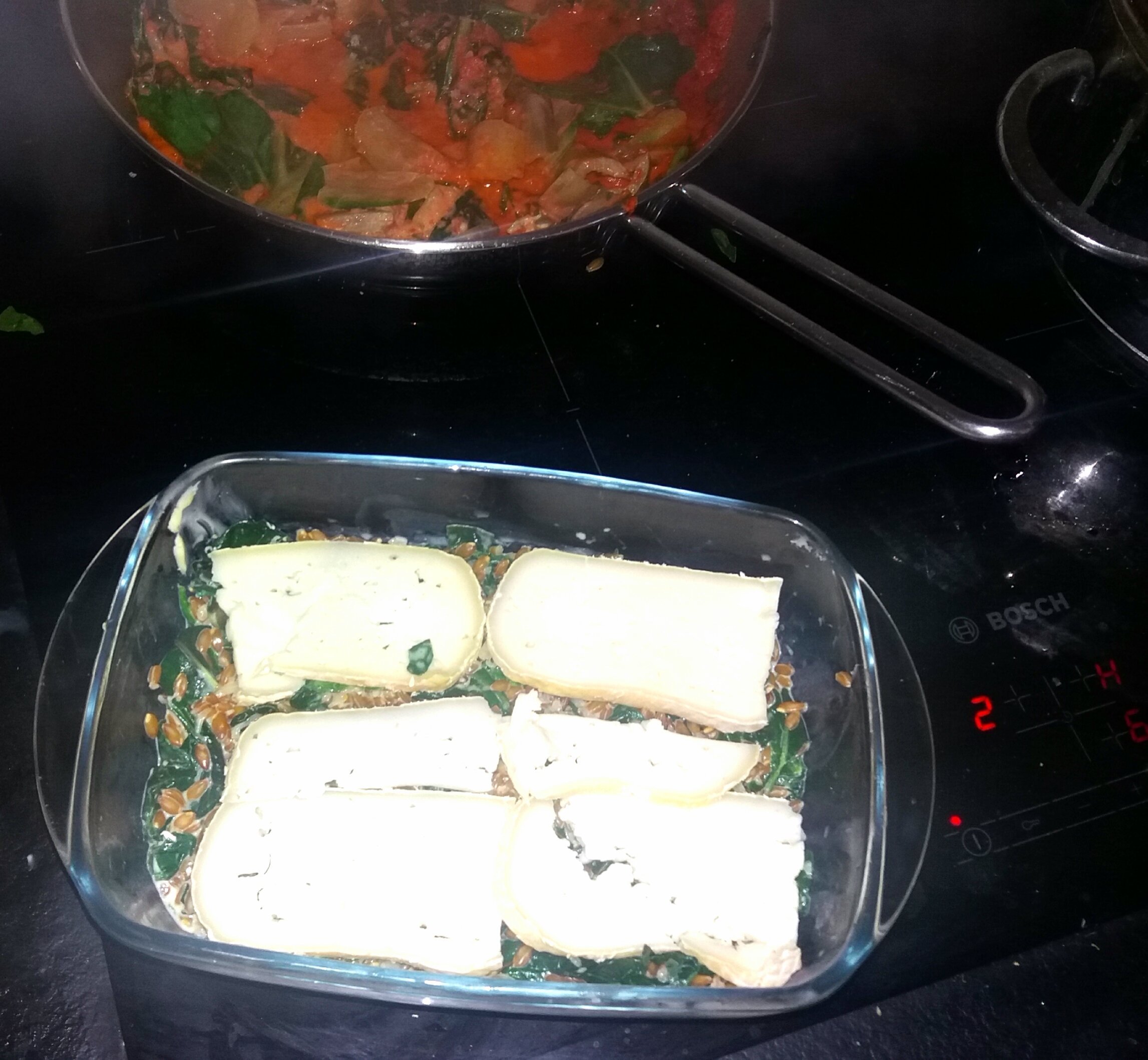 Pour ce soir : pierogis aux champignons et salade verte. Pour demain midi : gratin complet avec la plaquette de ravioles qu'il restait, des blettes, une tranche de jambon en lamelles, passata, ail et fromage. Et pour demain soir et mardi midi : gratin de petit épeautre et epinard fromage de brebis et crème d'avoine. Pour mardi soir : salade de radis et gratin de chou fleur et topinambours. Ca fait beaucoup de gratins mais cest tellement plus rapide et pratique de préparer mes plats en avance comme ça.