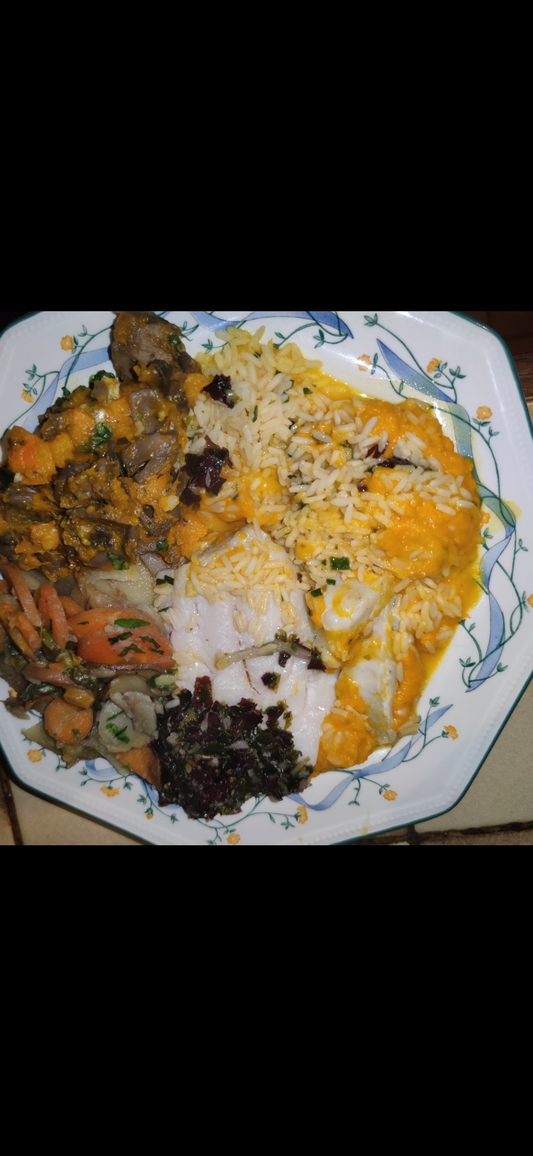 Sinon à droite filet de colin, riz, patate douces, en bas gauche lentilles, pommes de terres, carotte.