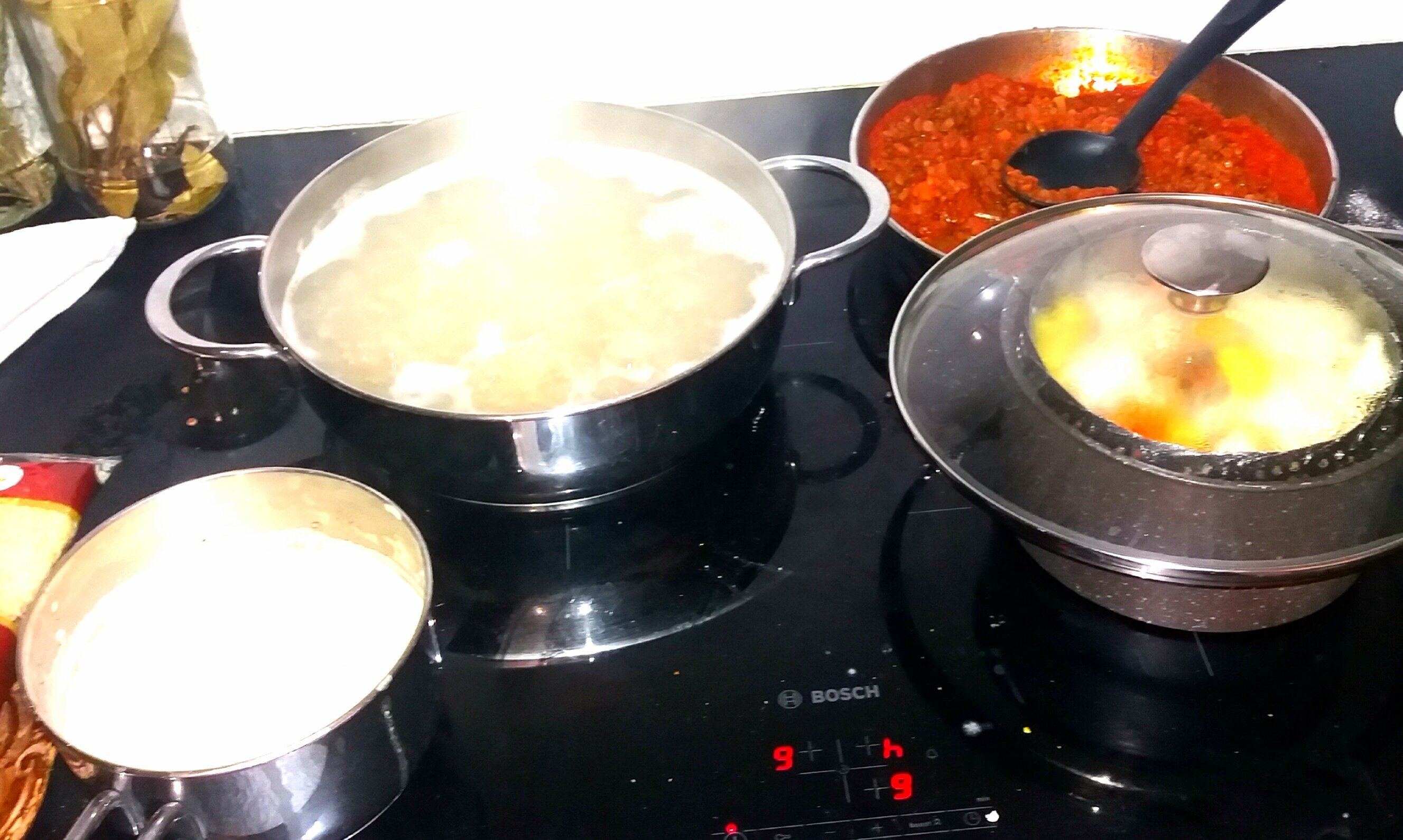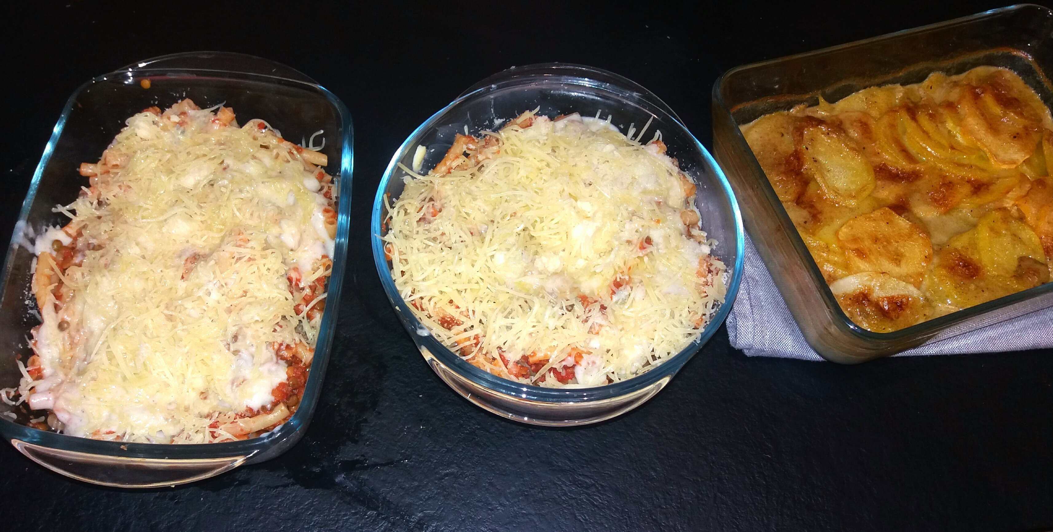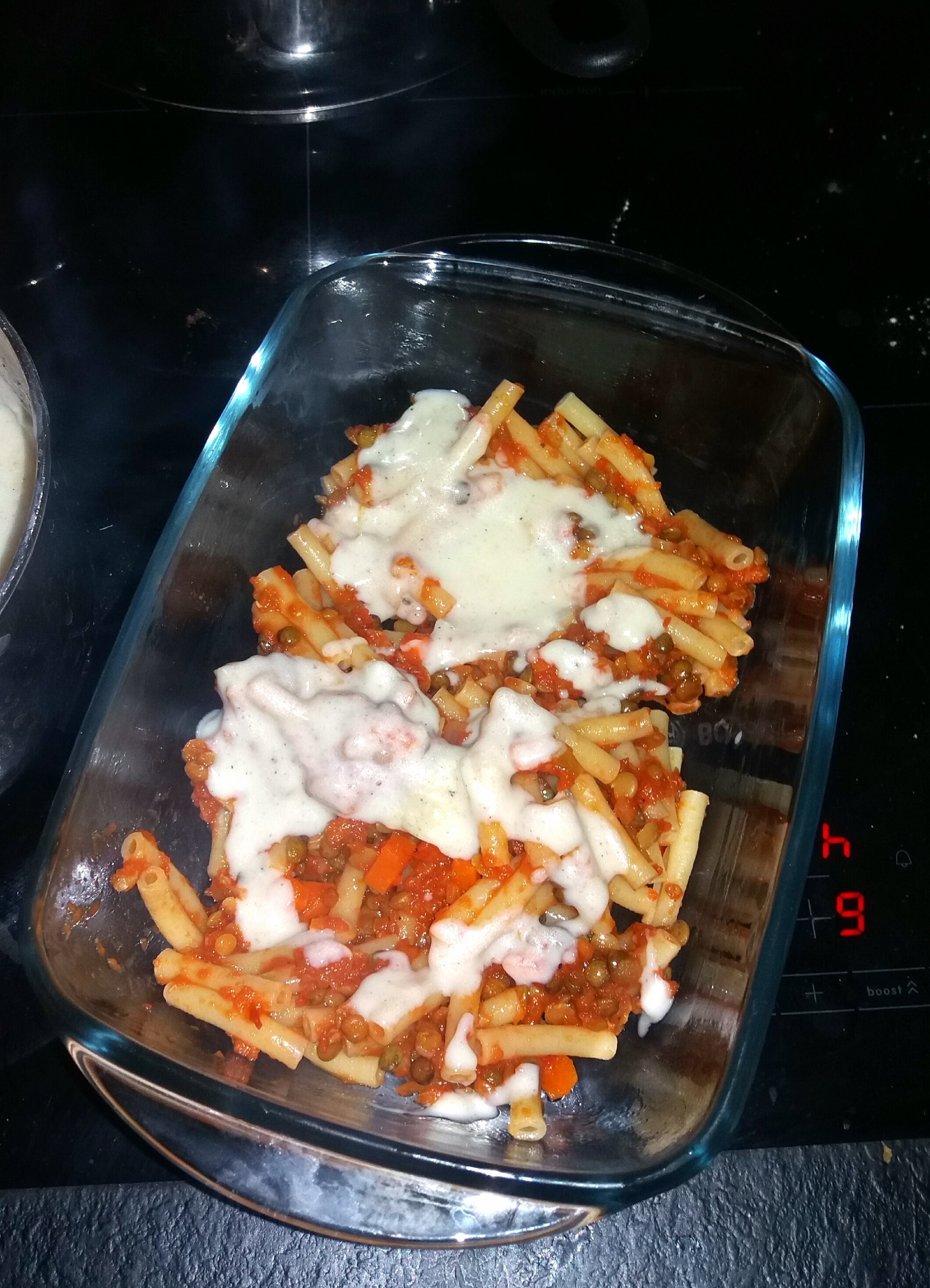 Je voulais faire des lasagnes mais je n'avais plus de pages alors j'ai fais du gratin de macaronis complets avec une bolognaise végétarienne au trio de lentilles