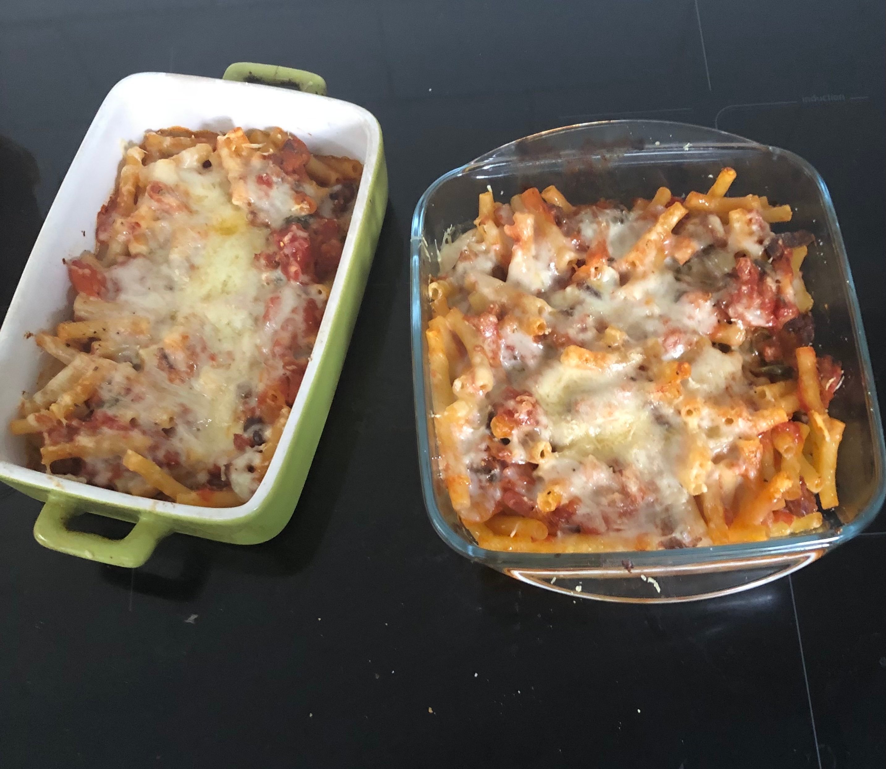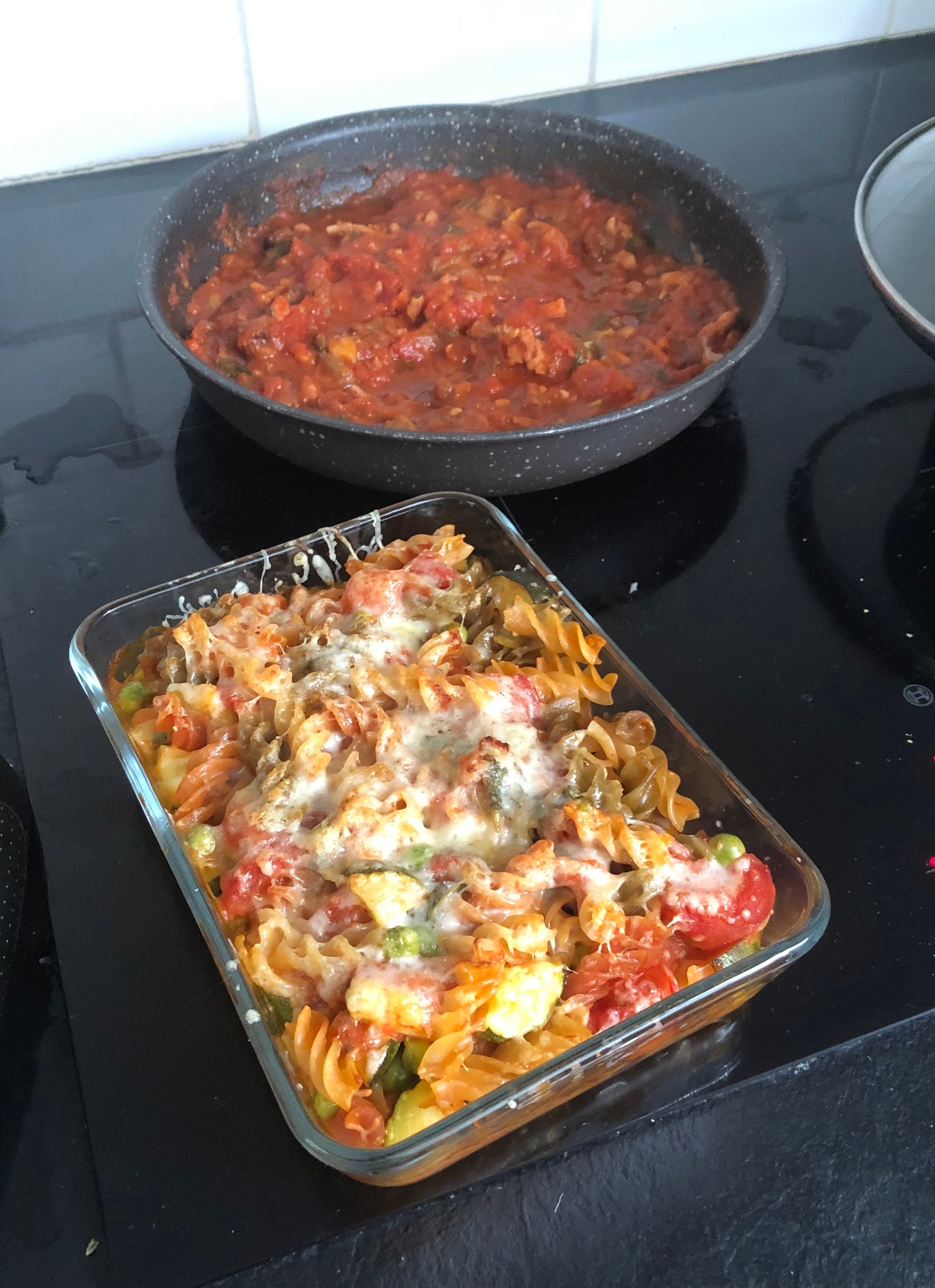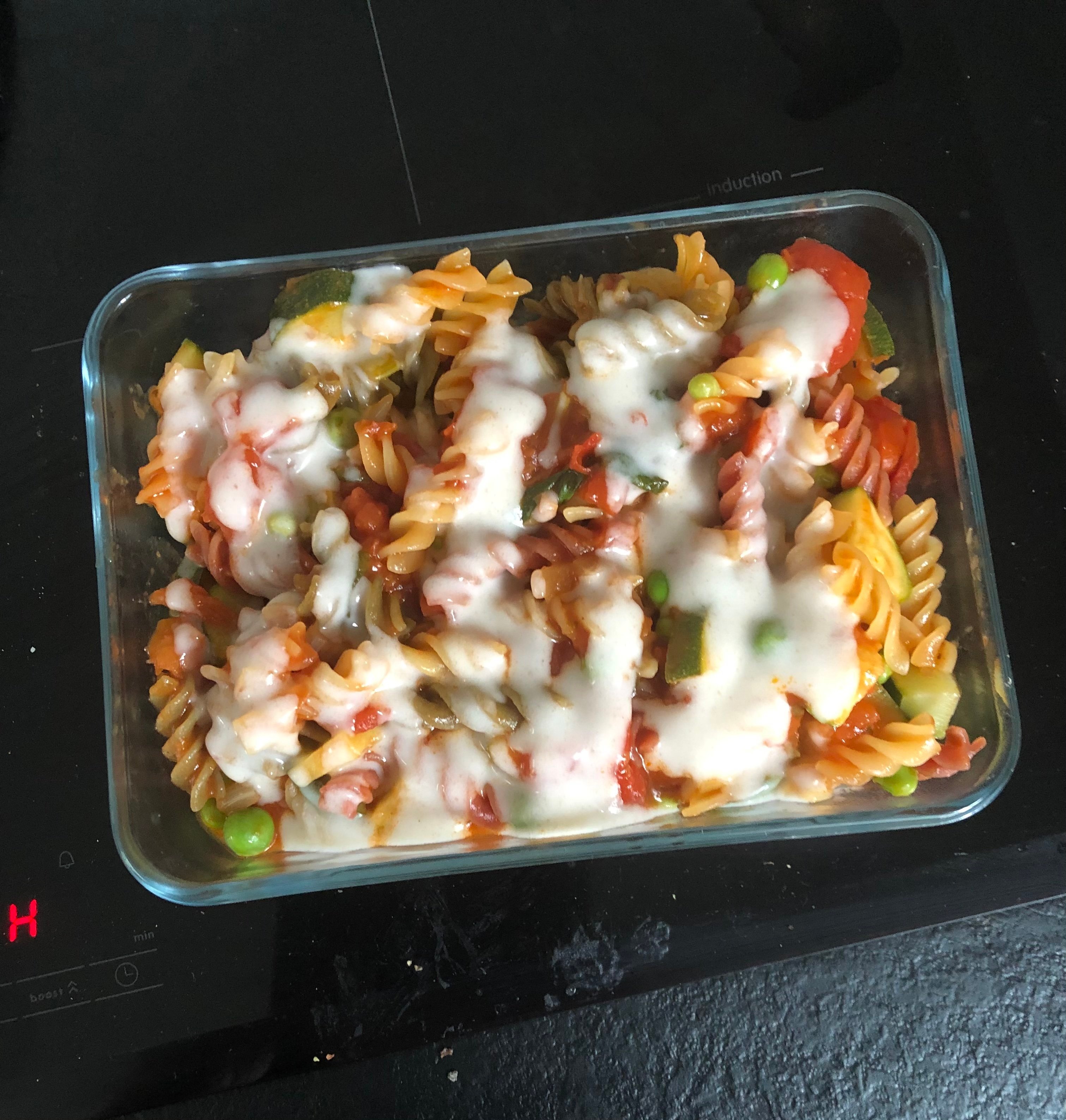 J’ai fais une sauce avec les restes de barbecues là c’est la version végétarienne dans un gratin de pâtes de quinoa