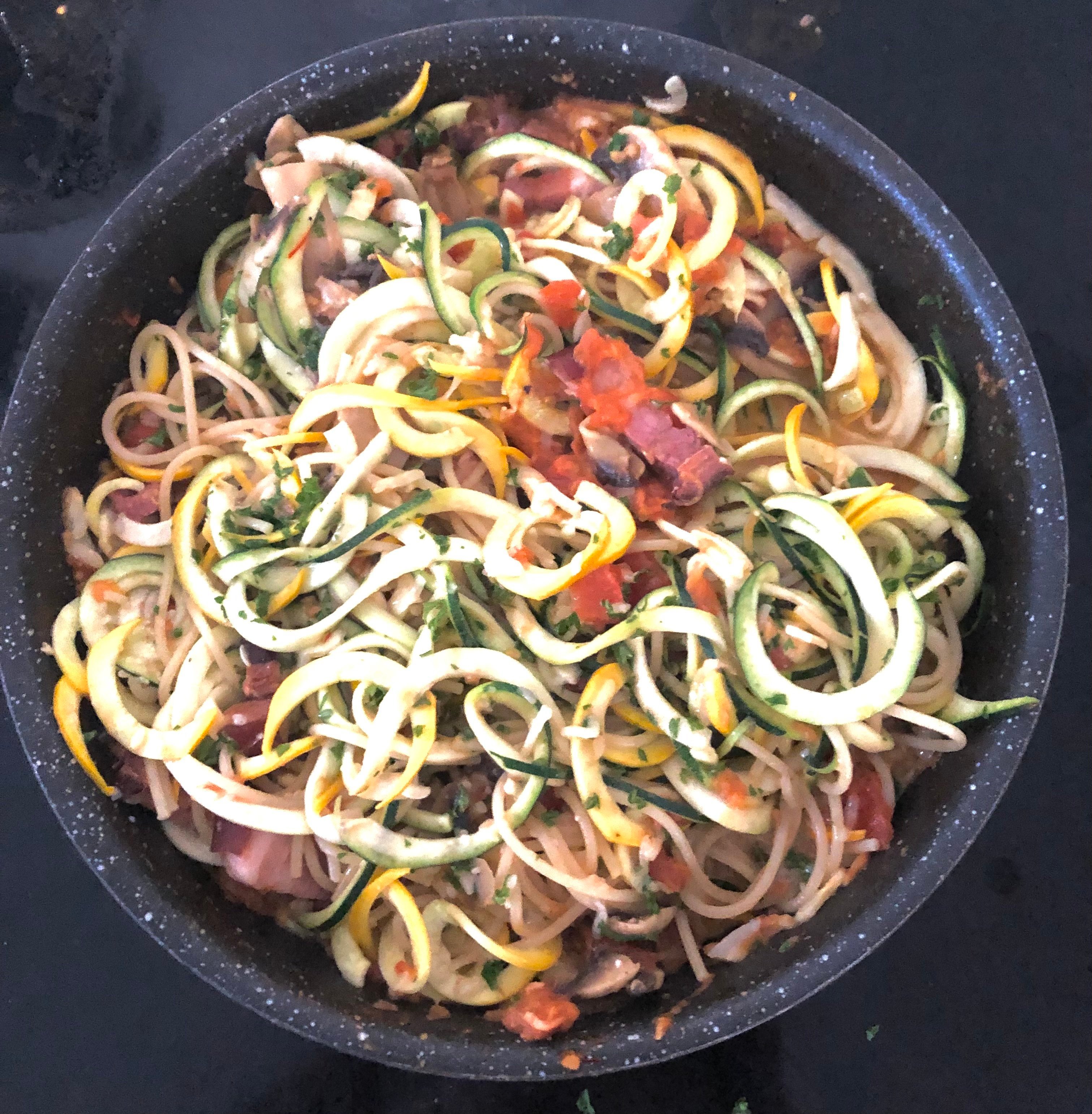 Ce soir ça devait être poulet Célestine mais je pense que je vais faire des spaghettis avec une sauce de tomates fraîches et de lard fumé d’un producteur de cochons local