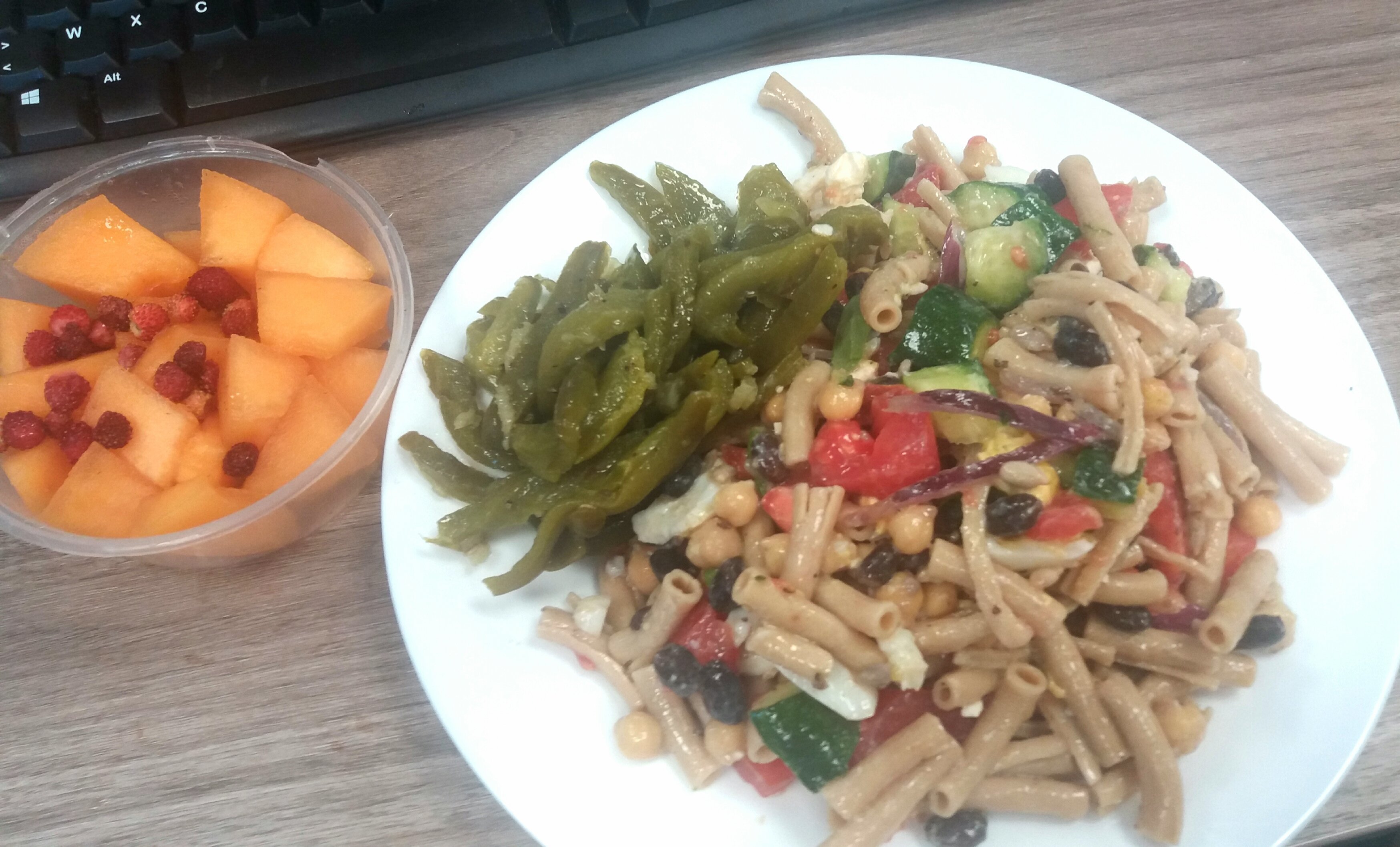 Le petit dej : reste de salade melon et maquereau en boire bio à la moutarde. Un peu de pain complet