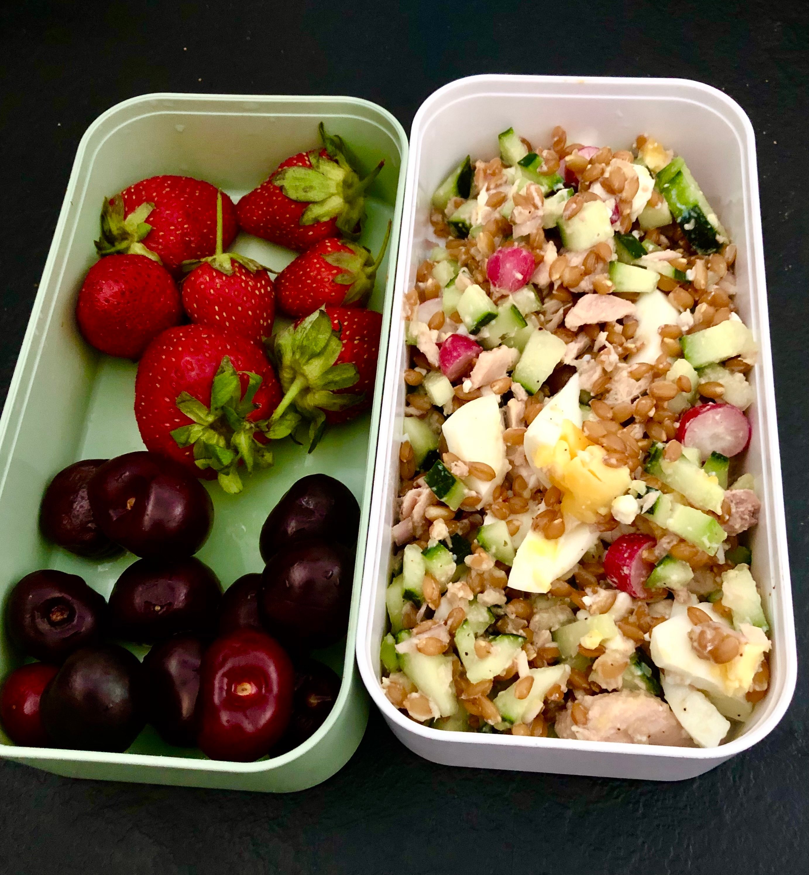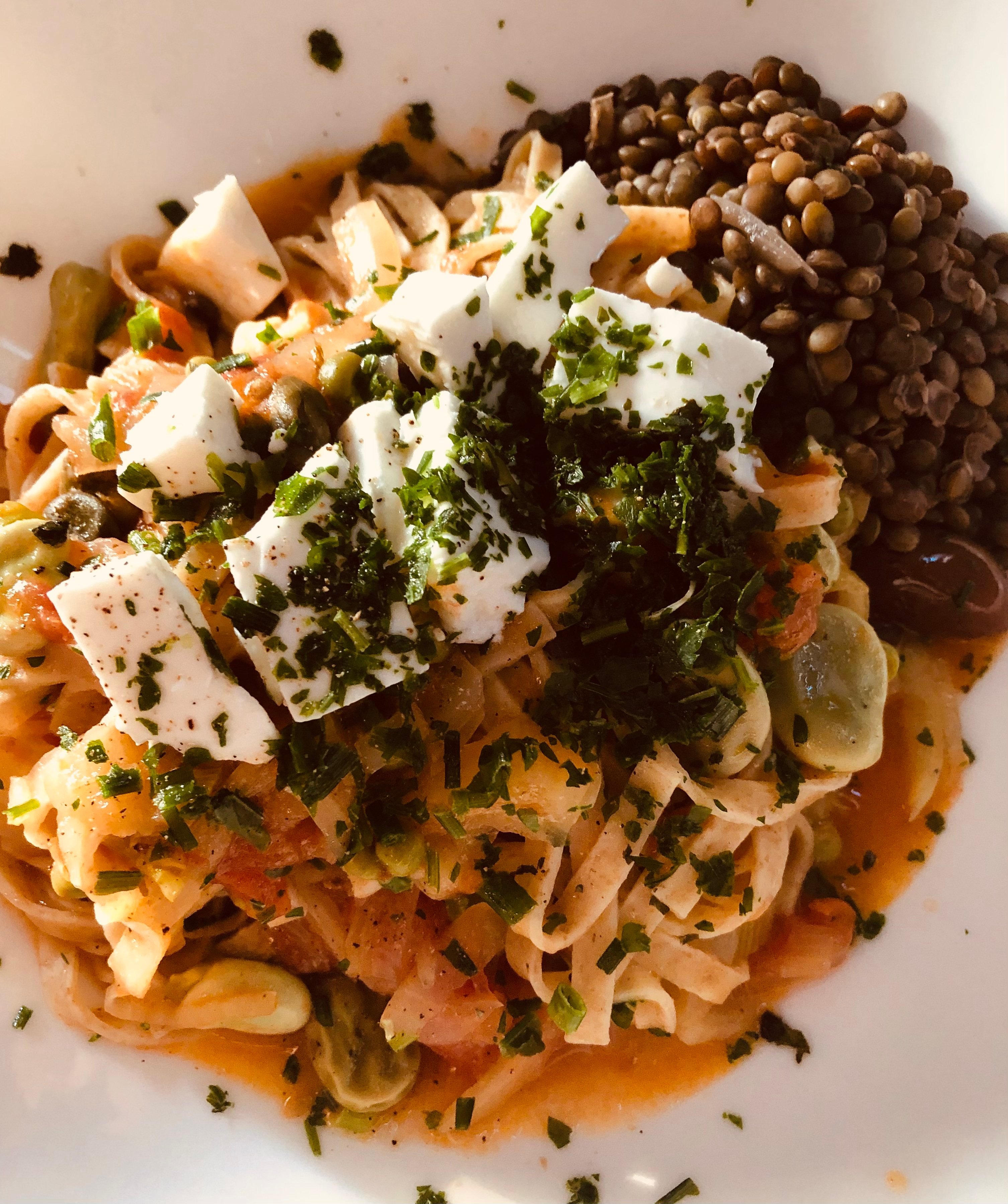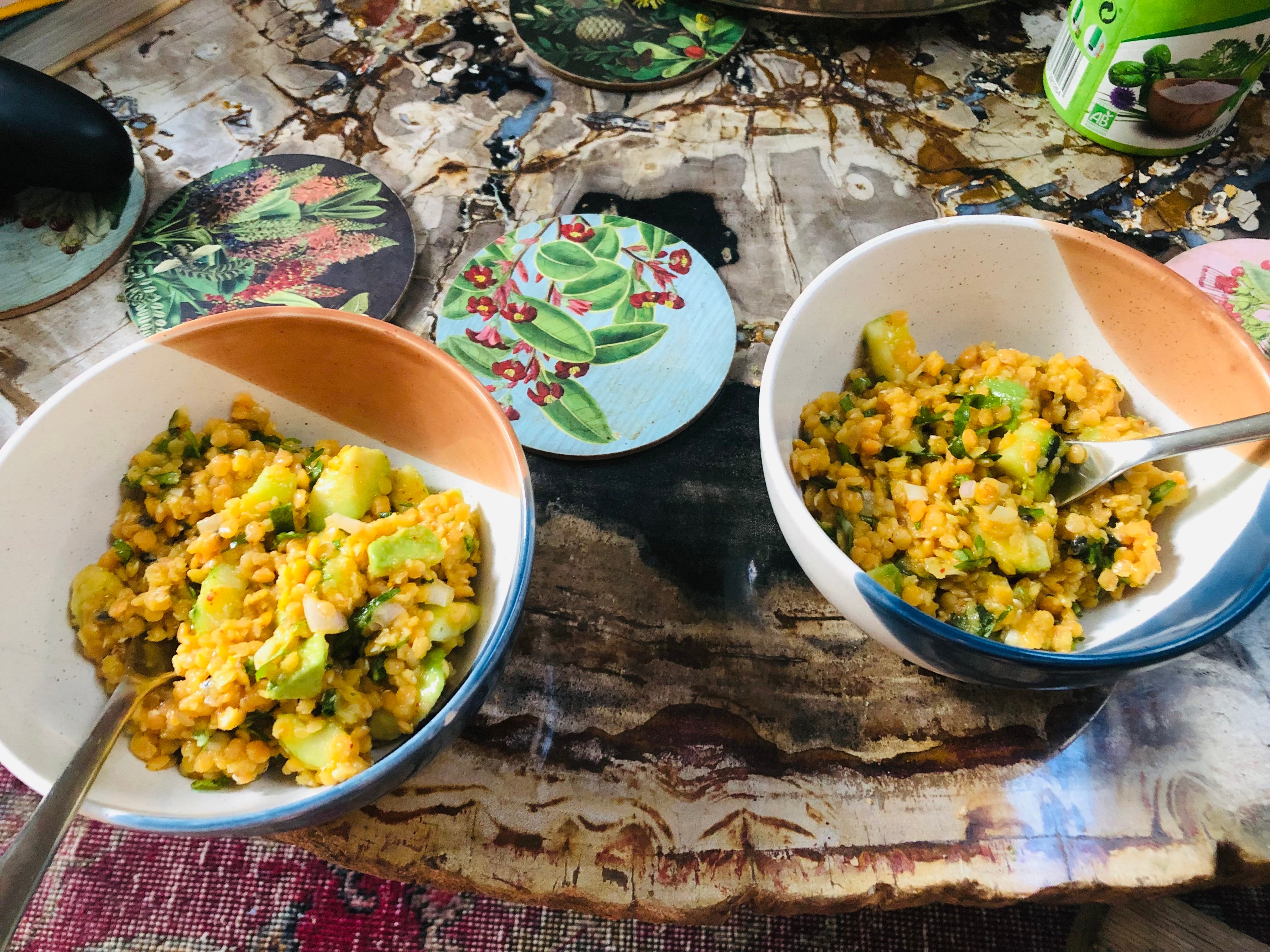 Ce soir : salade de lentilles corail, avec du concombre , fruit de la passion , coriandre , citron vert, piment , et les fameuses feuilles d’aster marine .