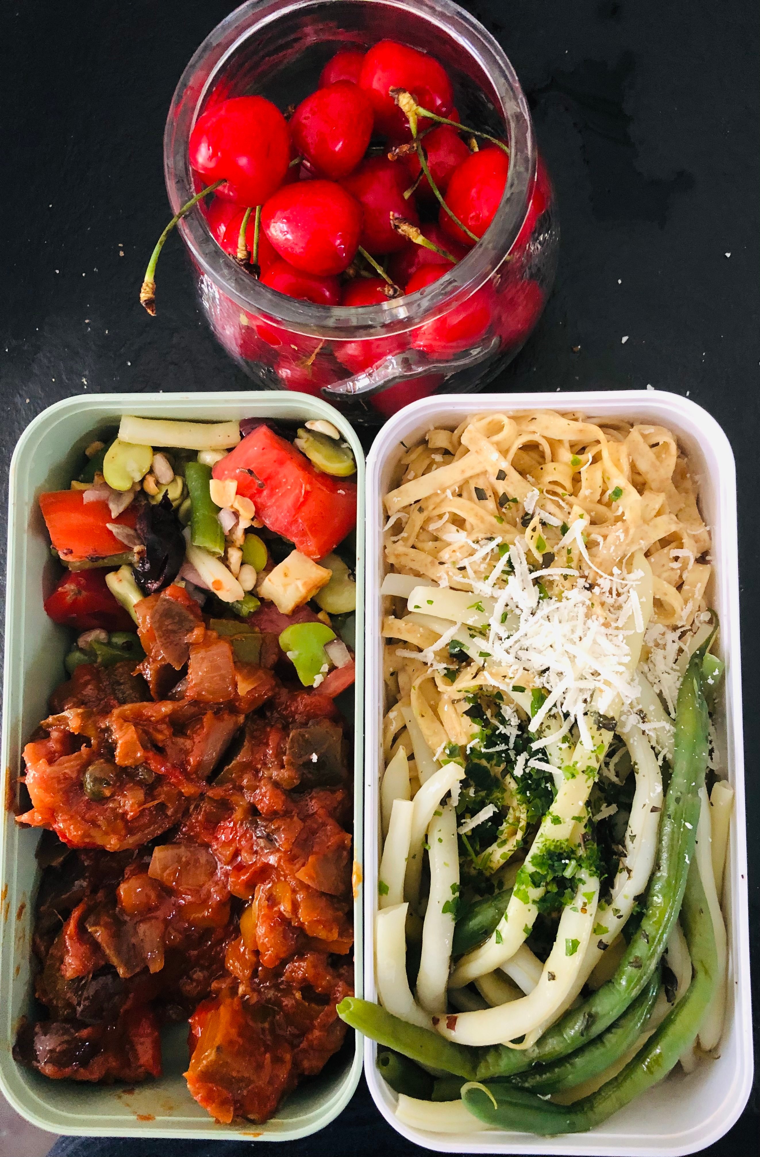 Pour demain , à gauche c’est de la caponata , sorte de ratatouille froide aux olives .