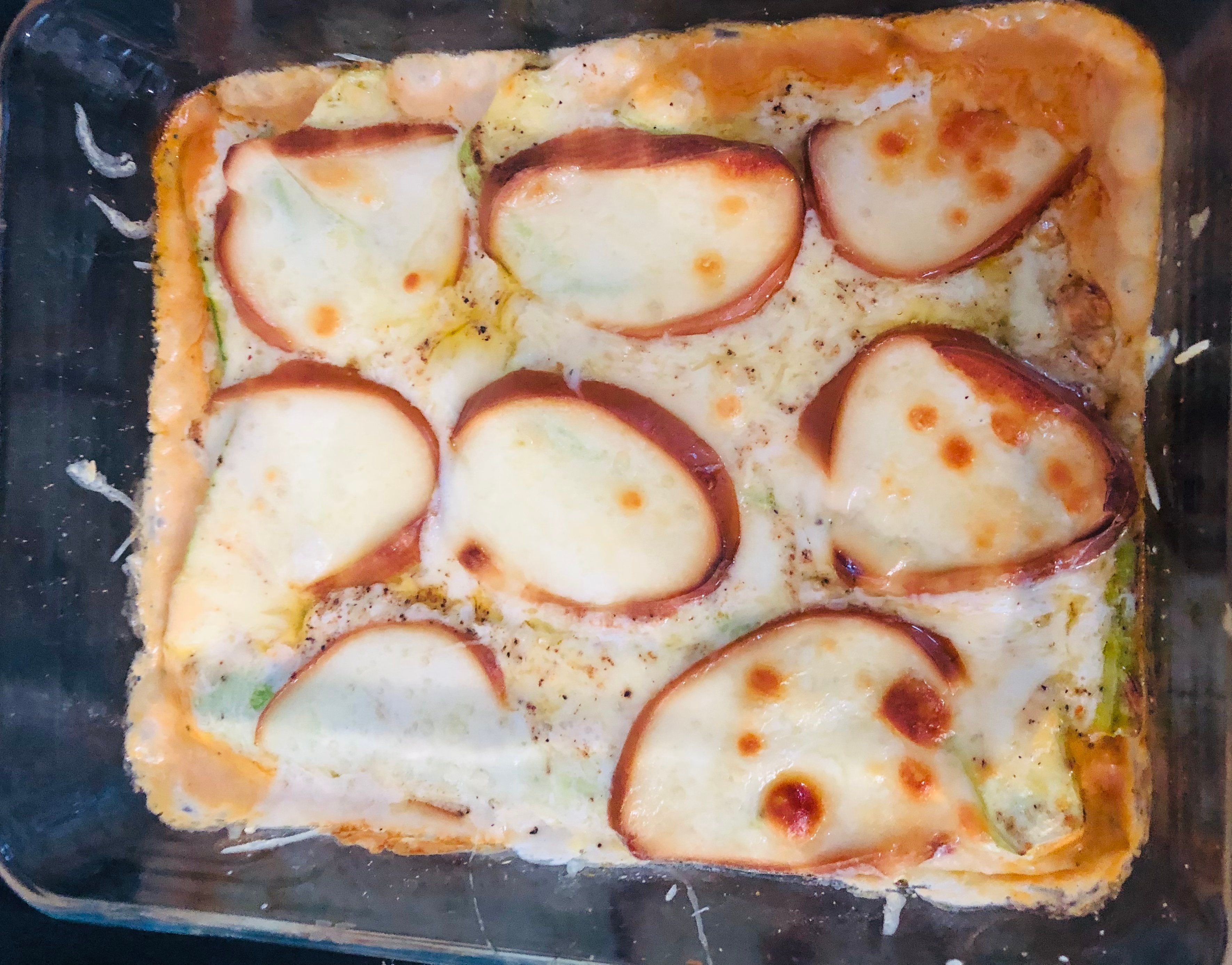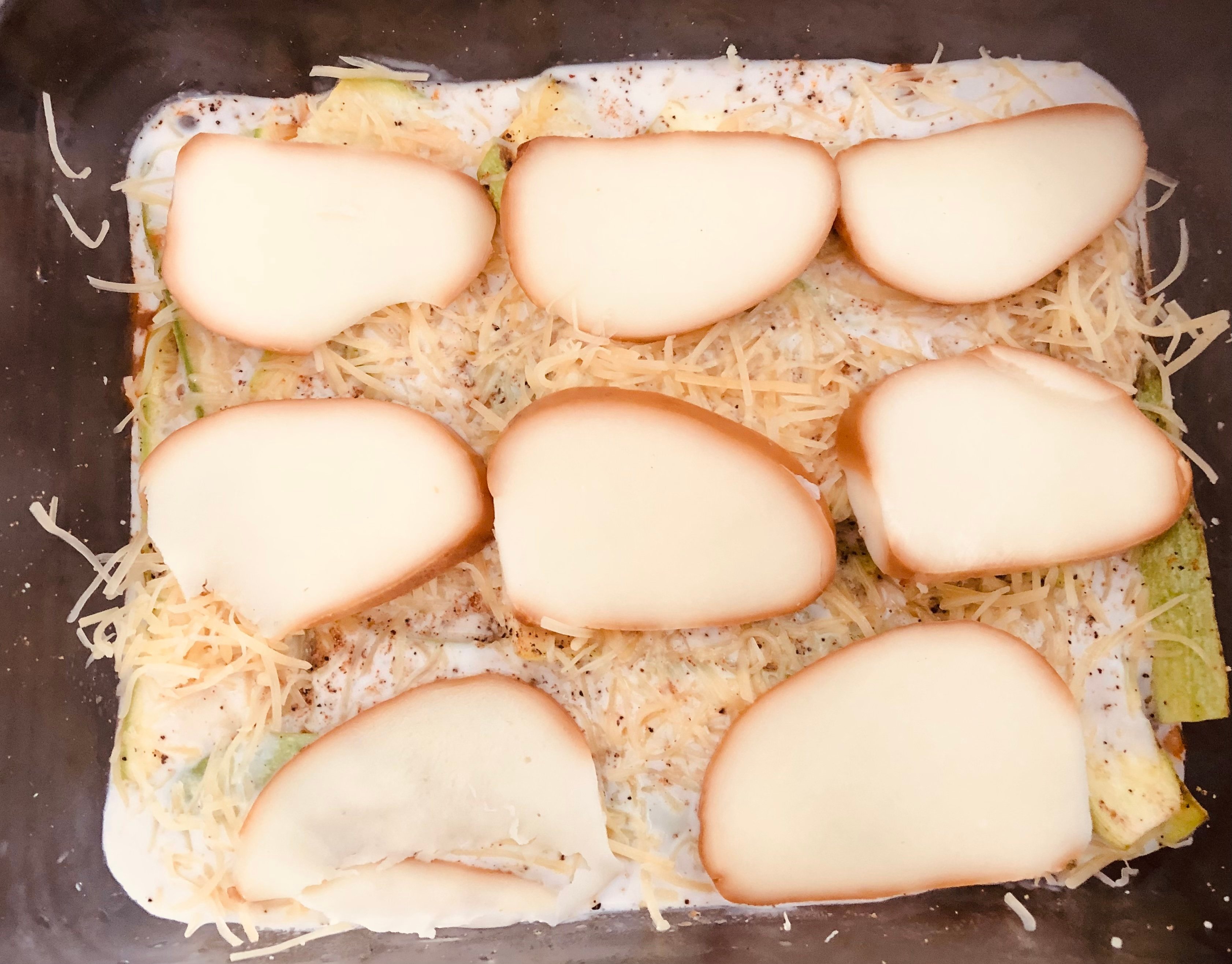 Gratin de courgette , mélange de blé d’épeautre et de sarrasin , de la tomate et de la scarmozza fumée .