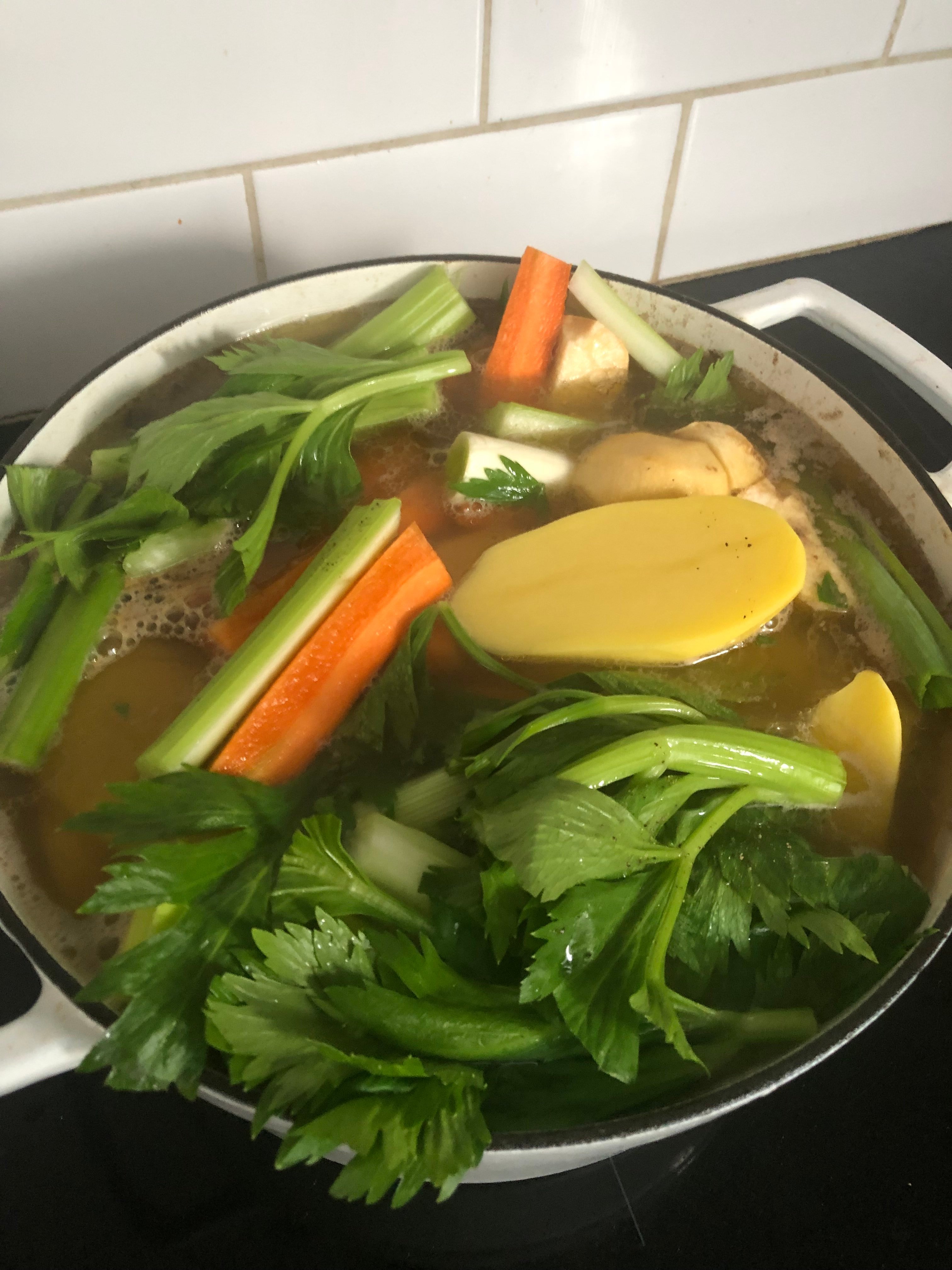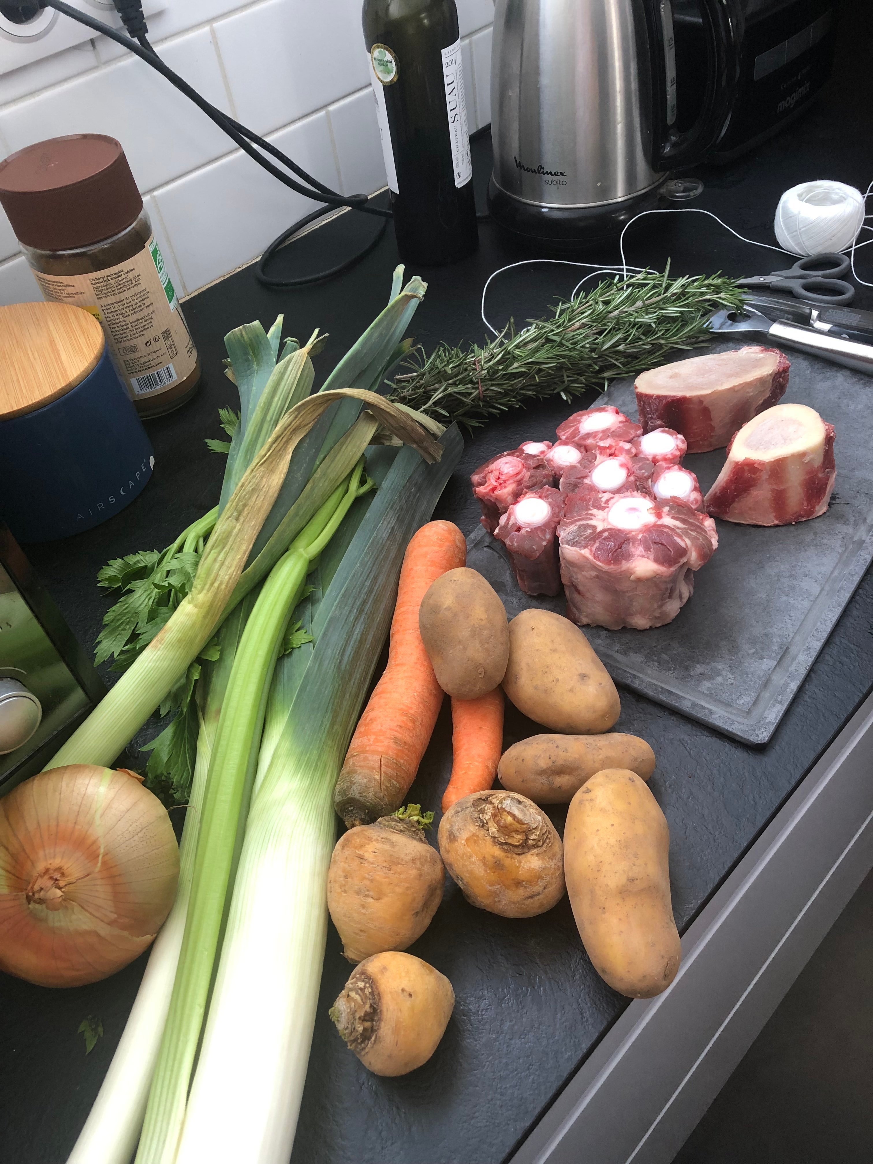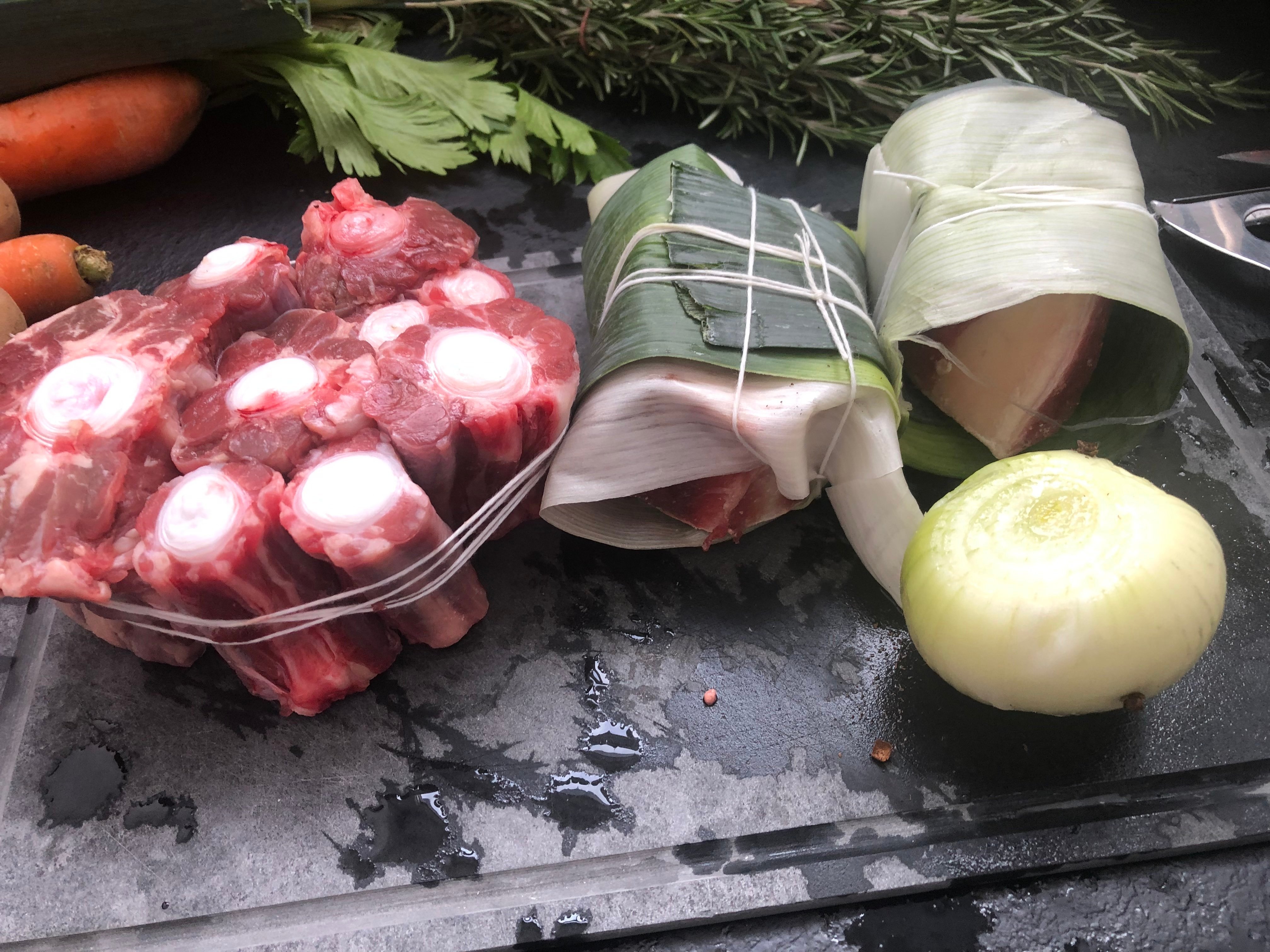 Je ficelle la viande (ici queue de bœuf) et j’emballe les os à moelle dans des feuilles de poireaux