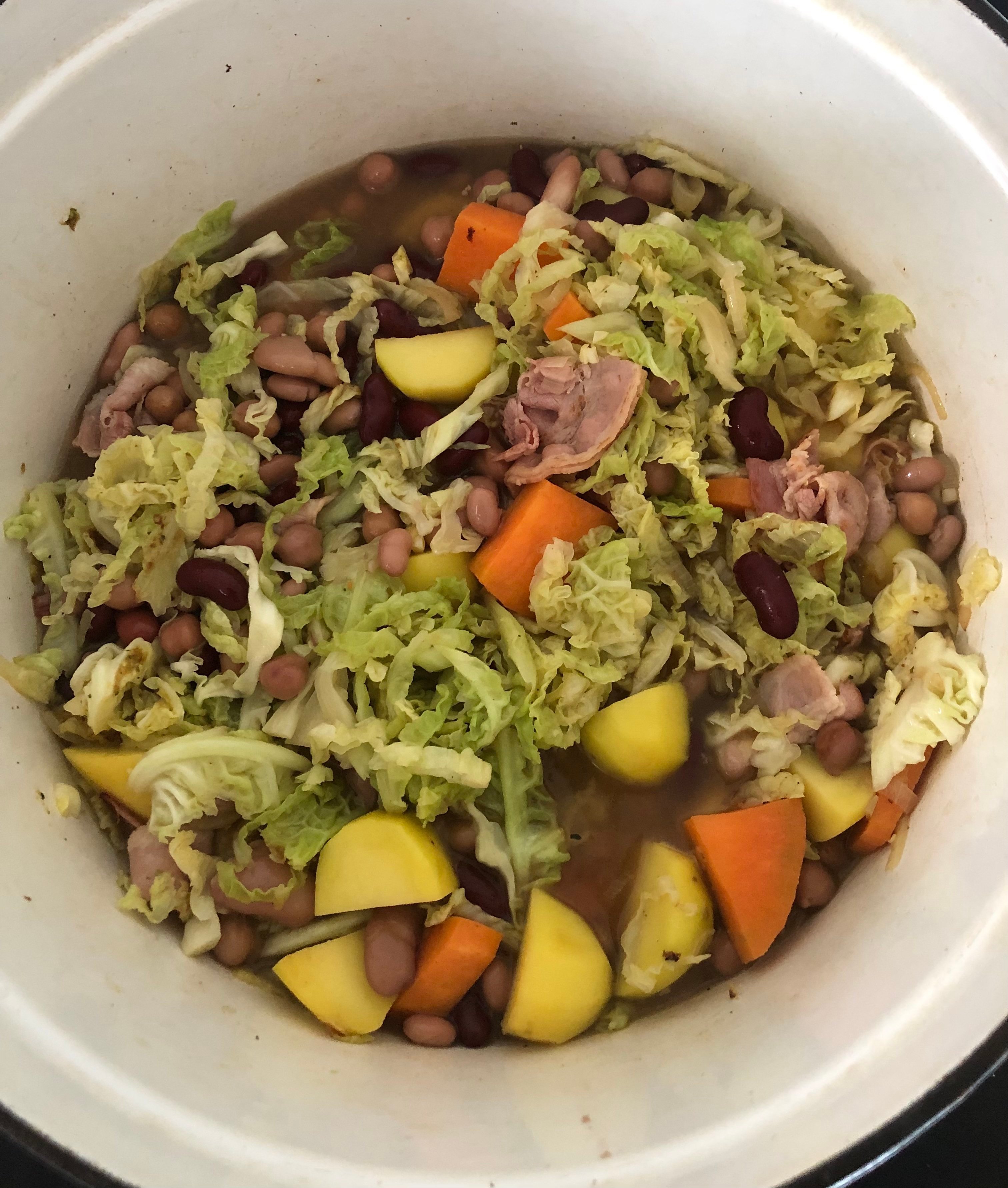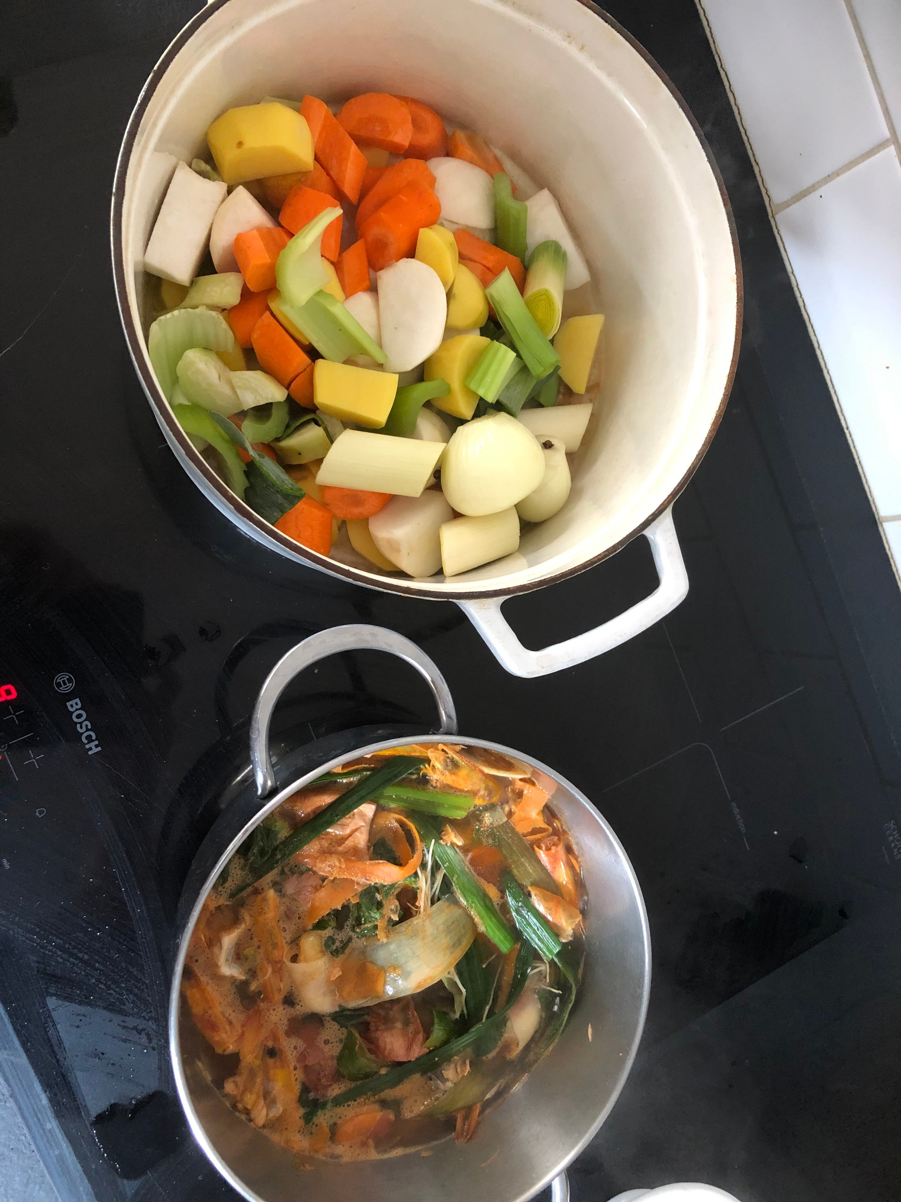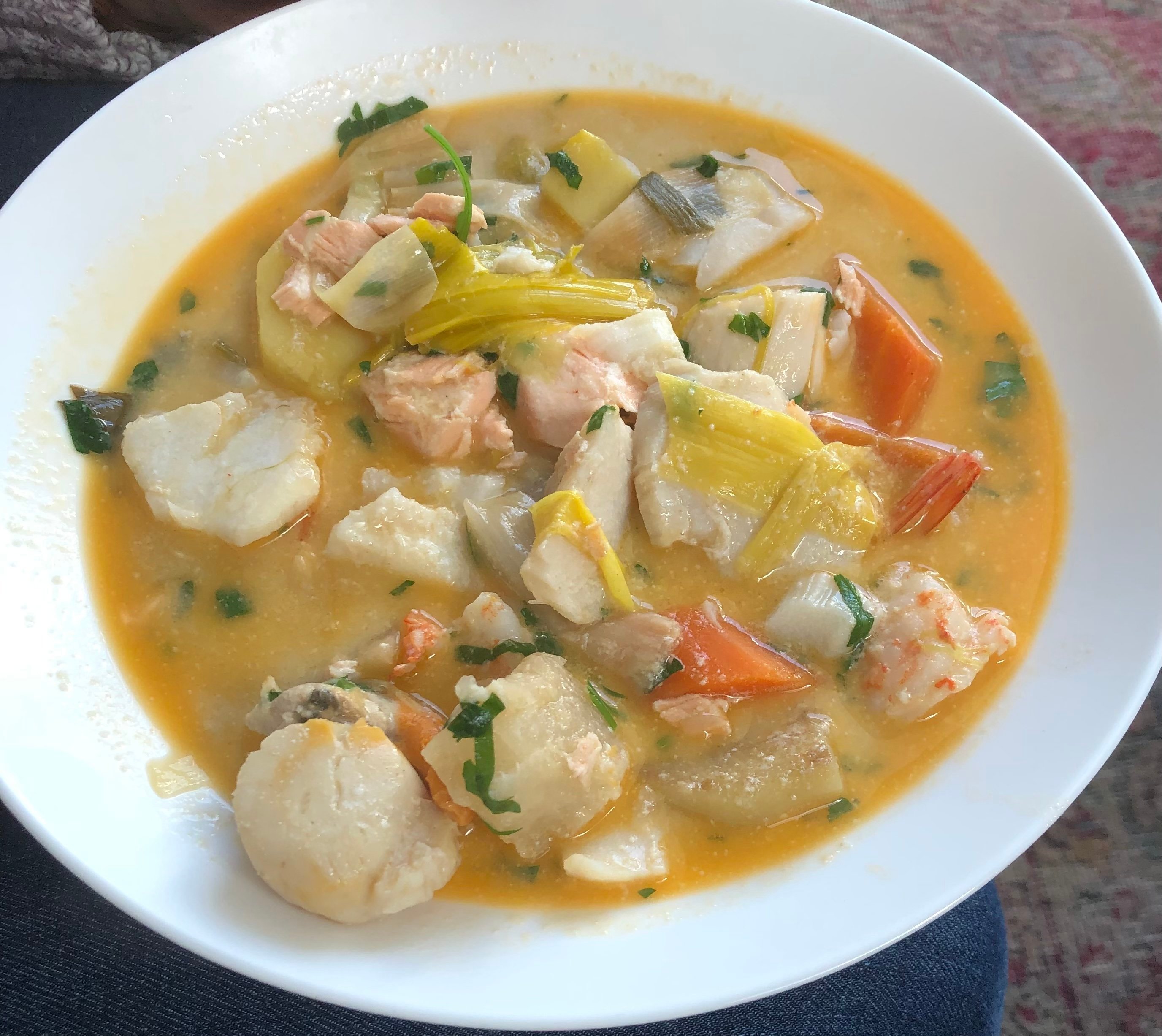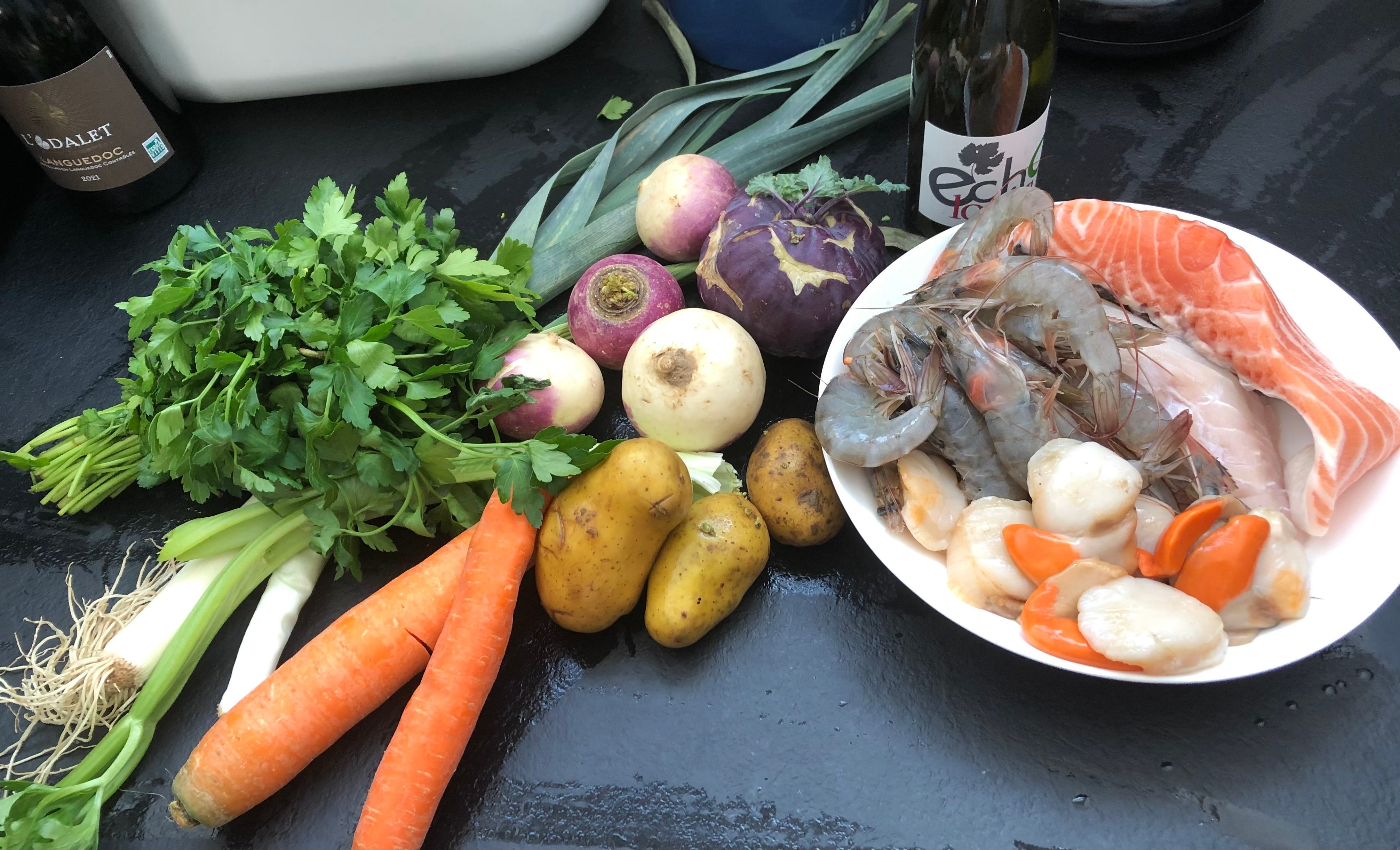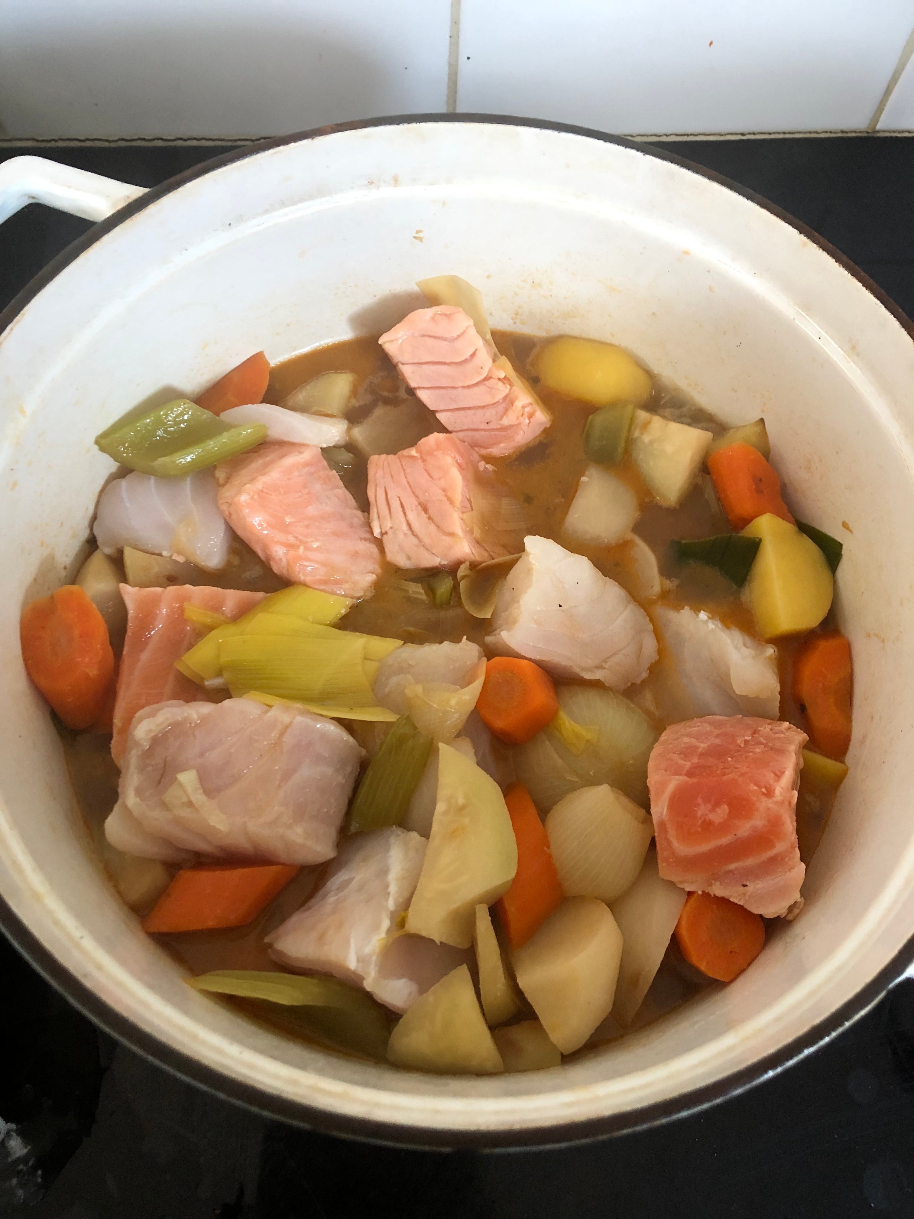 Il y a en légumes du chou rave des poireaux carottes pommes de terre , en poisson du dos de cabillaud un filet de saumon des crevettes et des saint Jacques qui avaient l’air magnifiques au marché donc on a craqué