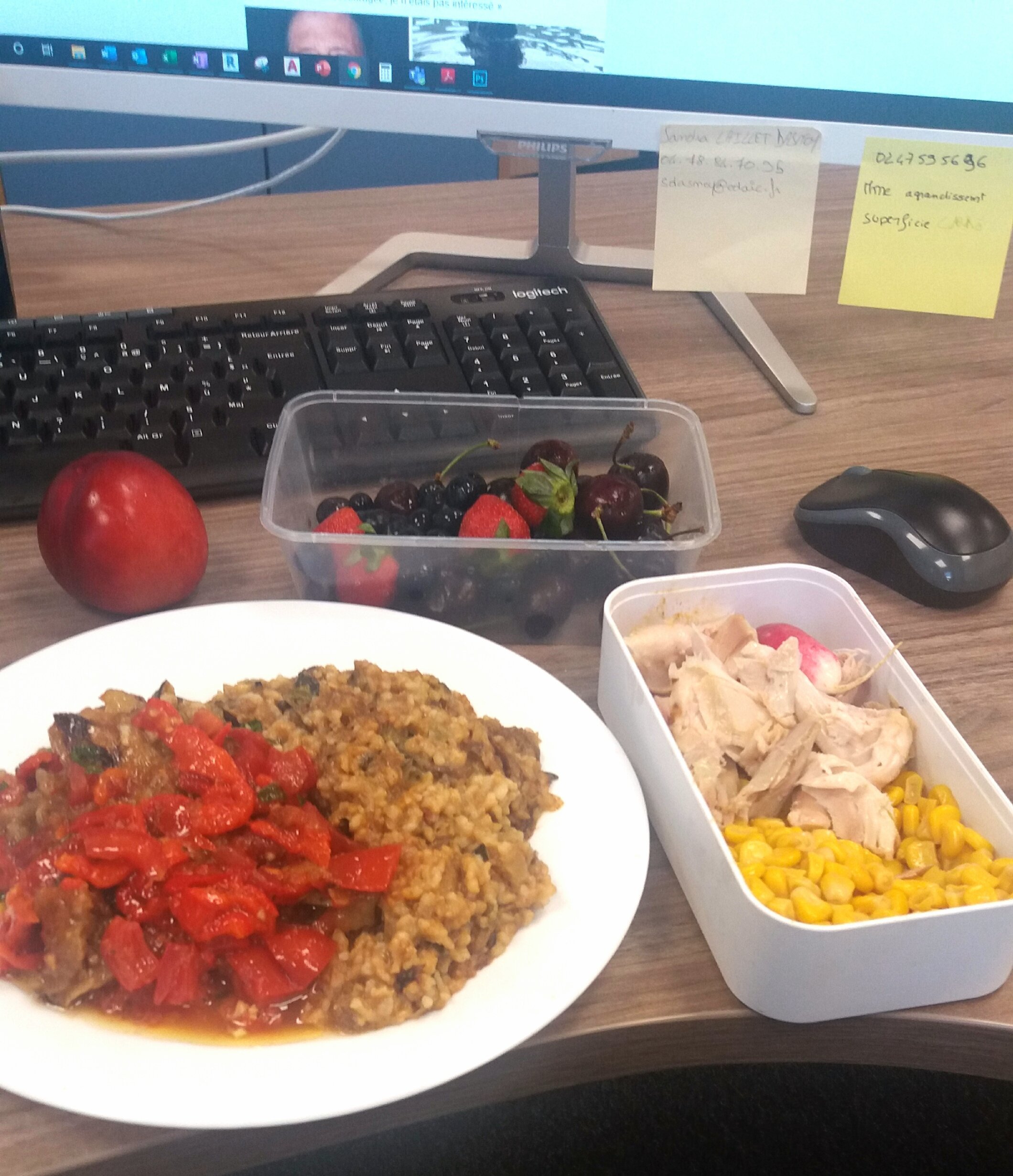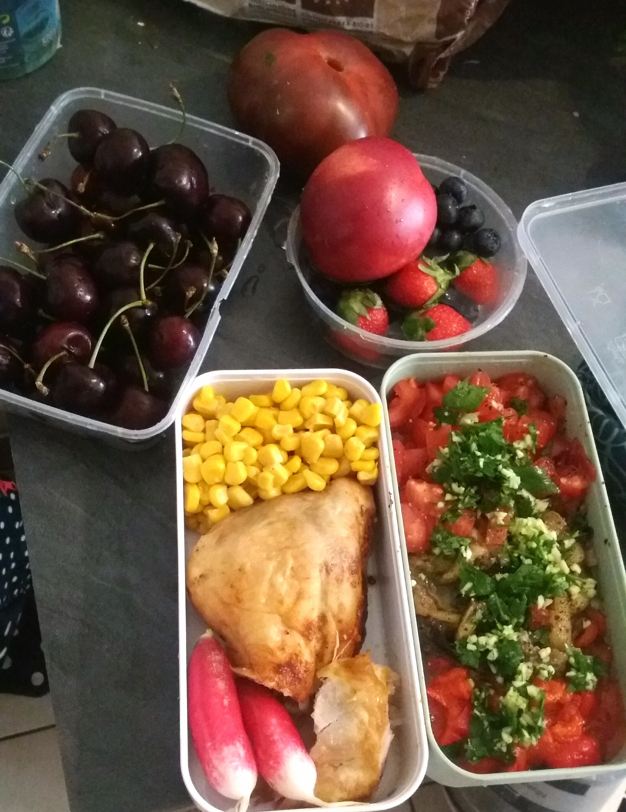 Reste de poulet de ce midi maïs et radis. Une salade tomate aubergines et poivrons rôtis à l'ail et au persil avec du piment. Des fruits en dessert.Tu manges dans des barquettes pourquoi ?
