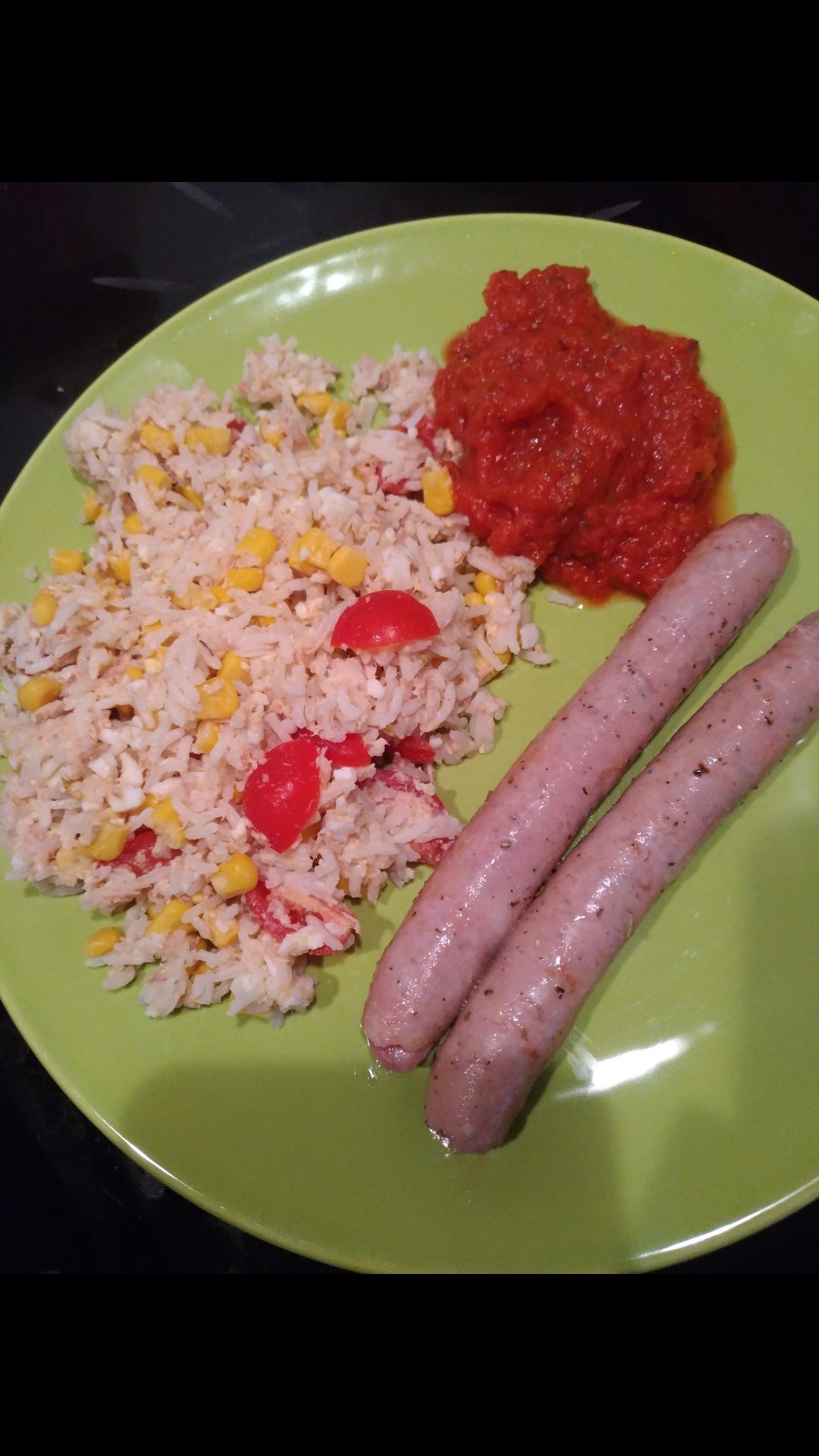 Une petite salade avec des saucisses et le reste de sauce de quand j'ai fait les pizzas