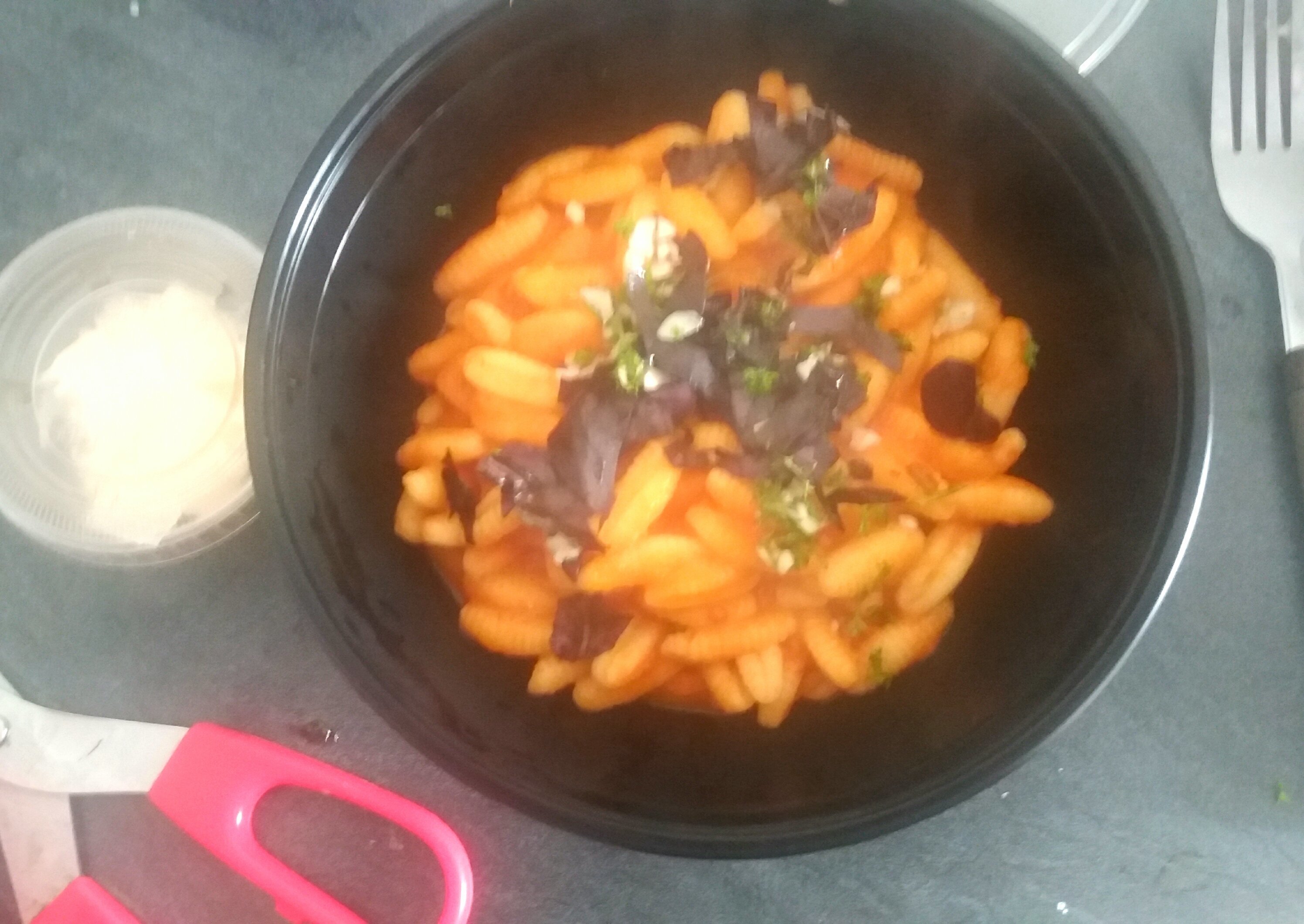 Repas de ce midi : pates avec une sauce maison au basilic. C'est dans une barquette car j'en ai fais pour l'asso pour eux qui distribue des repas aux SDF (si ca vous intéresse je vous conseille d'aller voir ce qu'ils font). J'ai fais un gratin de chou fleur avec et une salade de fruits myrtilles pomme Orange fruit de la passion menthe et basilic