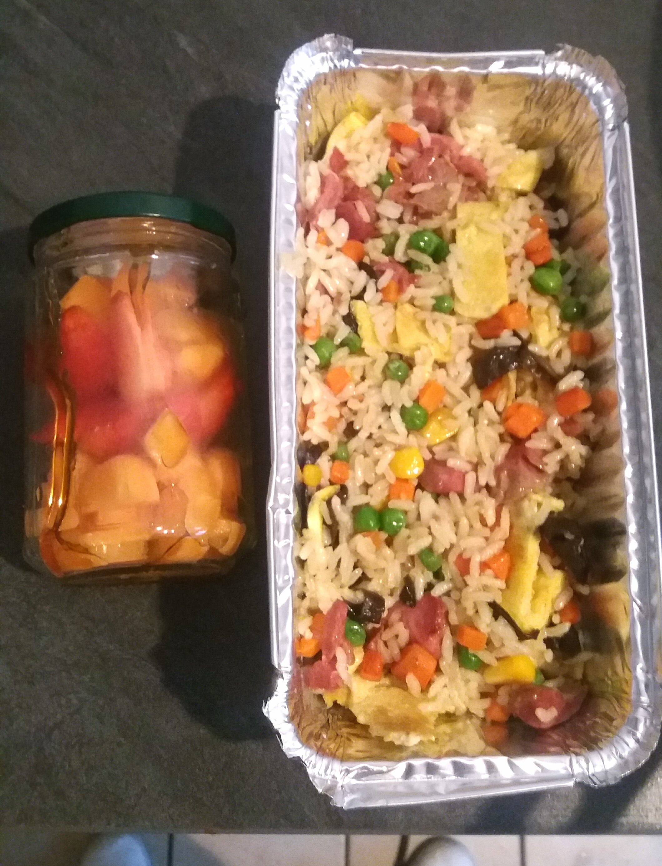 Riz cantonais aux gesiers de poulet confits (J'ai pas mis de porc au cas oùla personne en mangerait pas et les gesiers c'est délicieux ) une salade de fruits au miel (fraises melon abricots). J'ai ajouté une part de cake tomates et feta et des gâteaux choix caramel.
