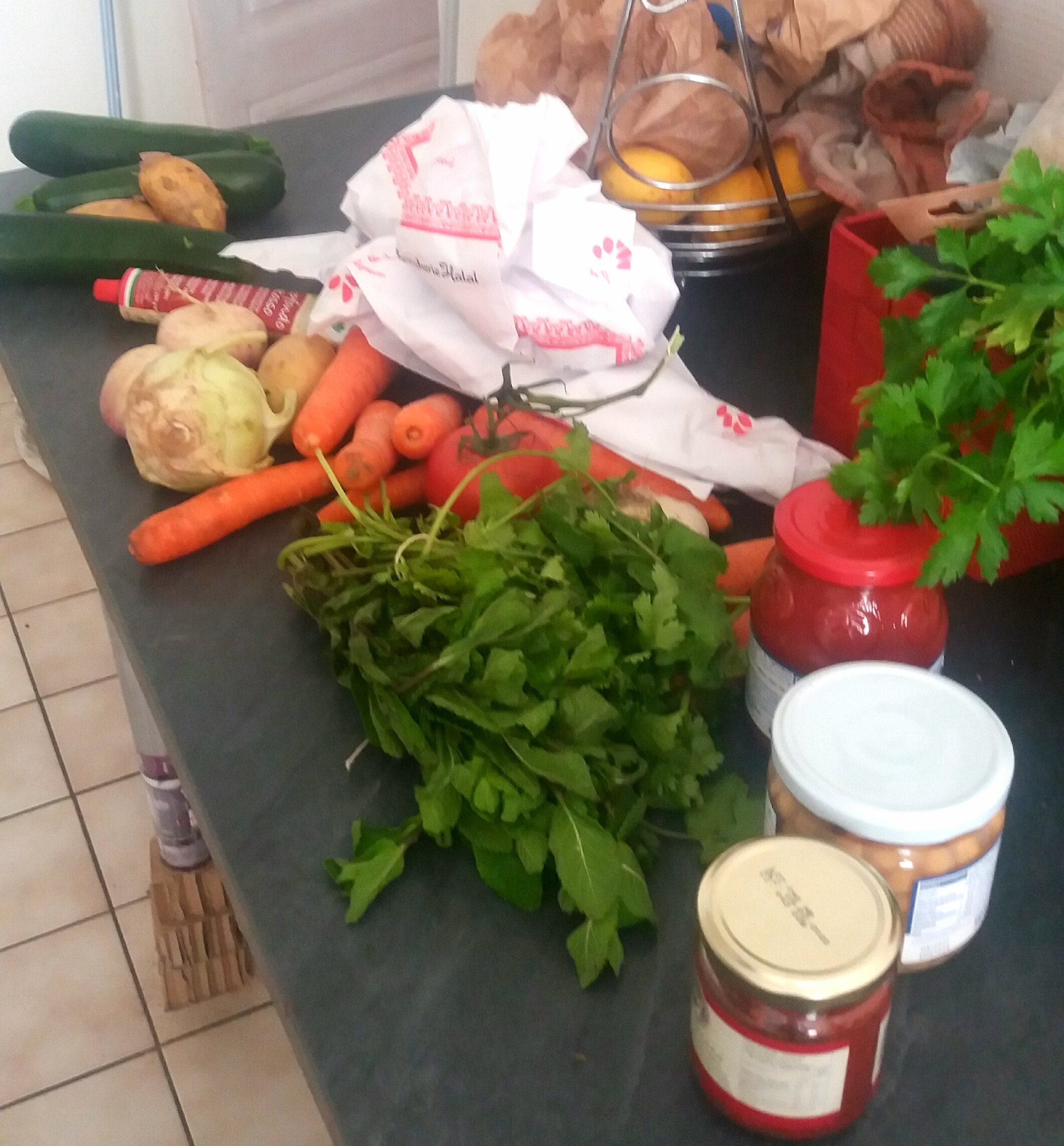 J'ai commencé par réunir les ingrédients (bio) légumes de saison déjà . En hiver faut remplacer les courgettes par de la courge. J 'aime mettre du chou vert aussi mais j'en ai pas trouvé car on est hors saison. Il faut toujours en base navets carottes et pois chiches. En herbe : coriandre persil et menthe.