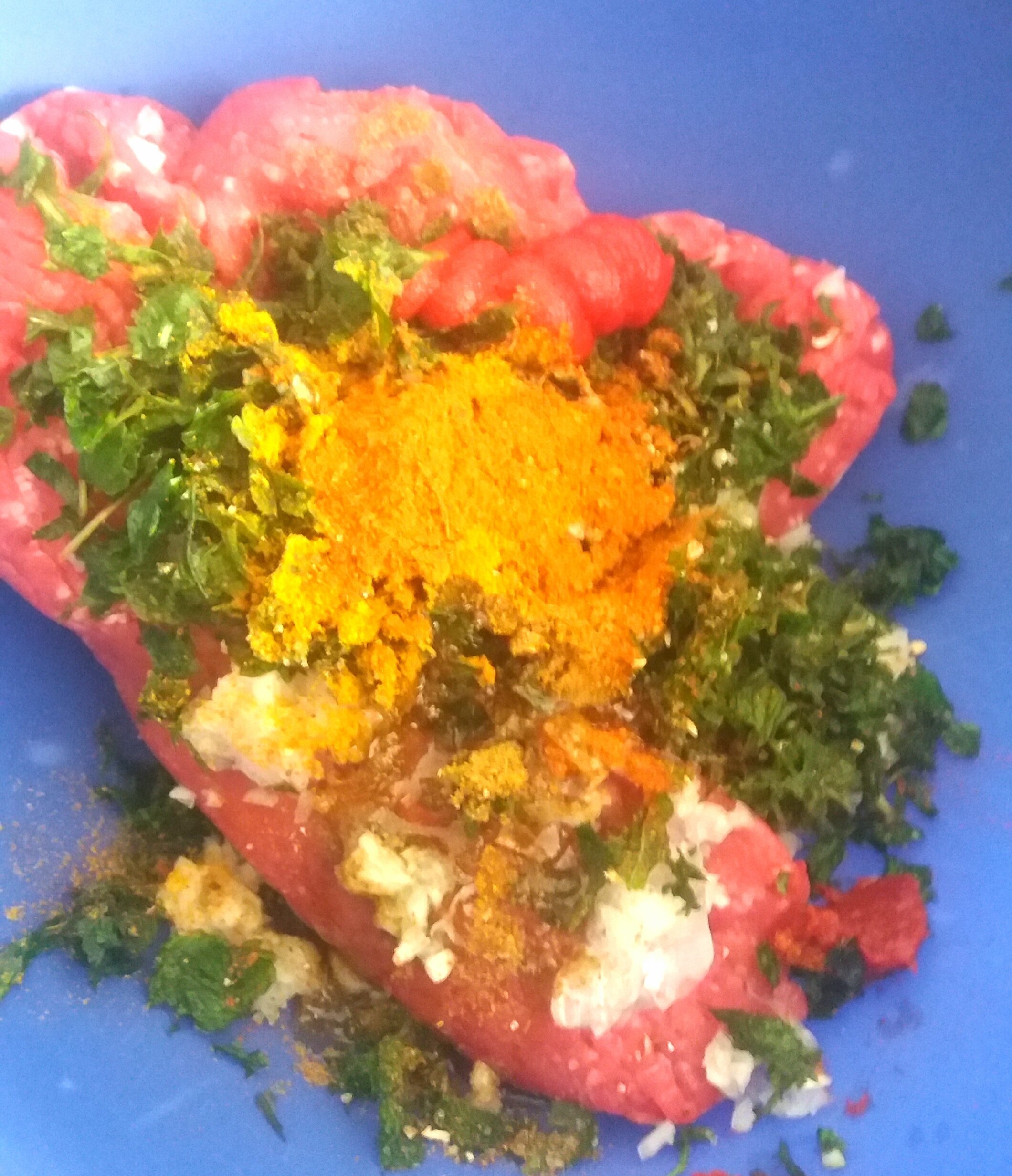 D'ailleurs on va commencer par ça :je mélange du boeuf haché avec une blinde de menthe persil et coriandre. Concentré de tomates huile d'olives qui oignons hachés. Cumin paprika.
