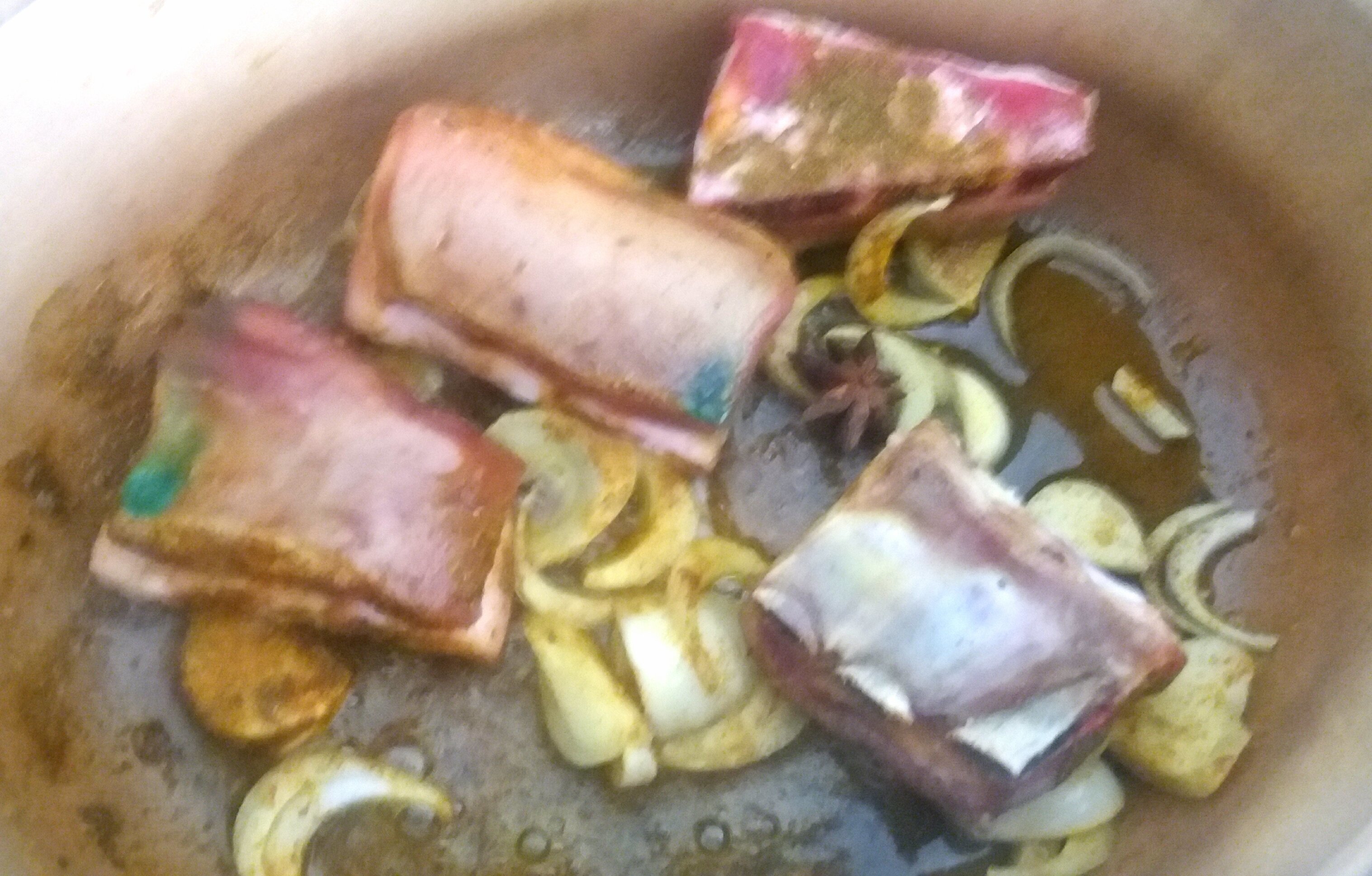 Maintenant que c'est fait, je fais revenir oignon et agneau dans une cocotte