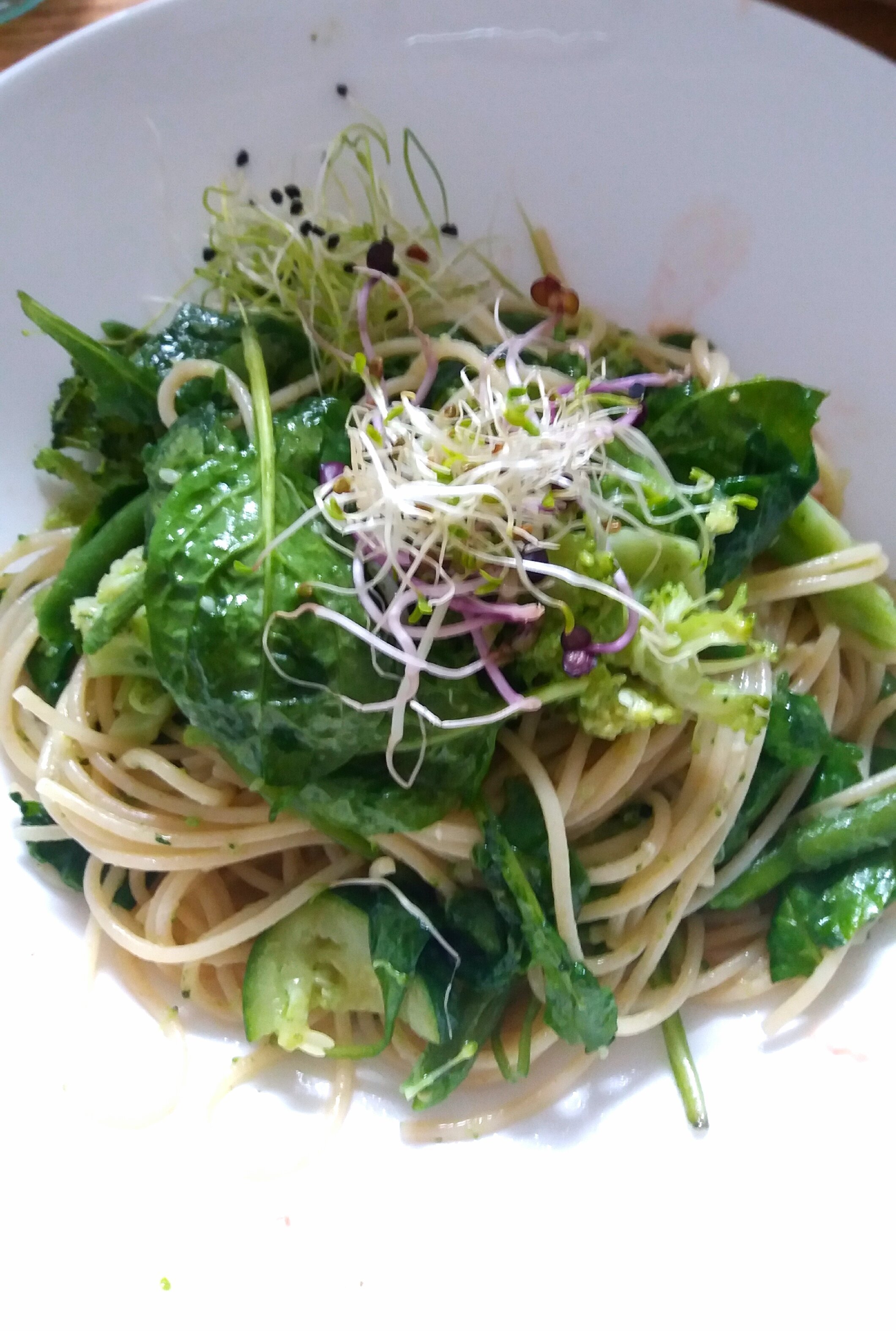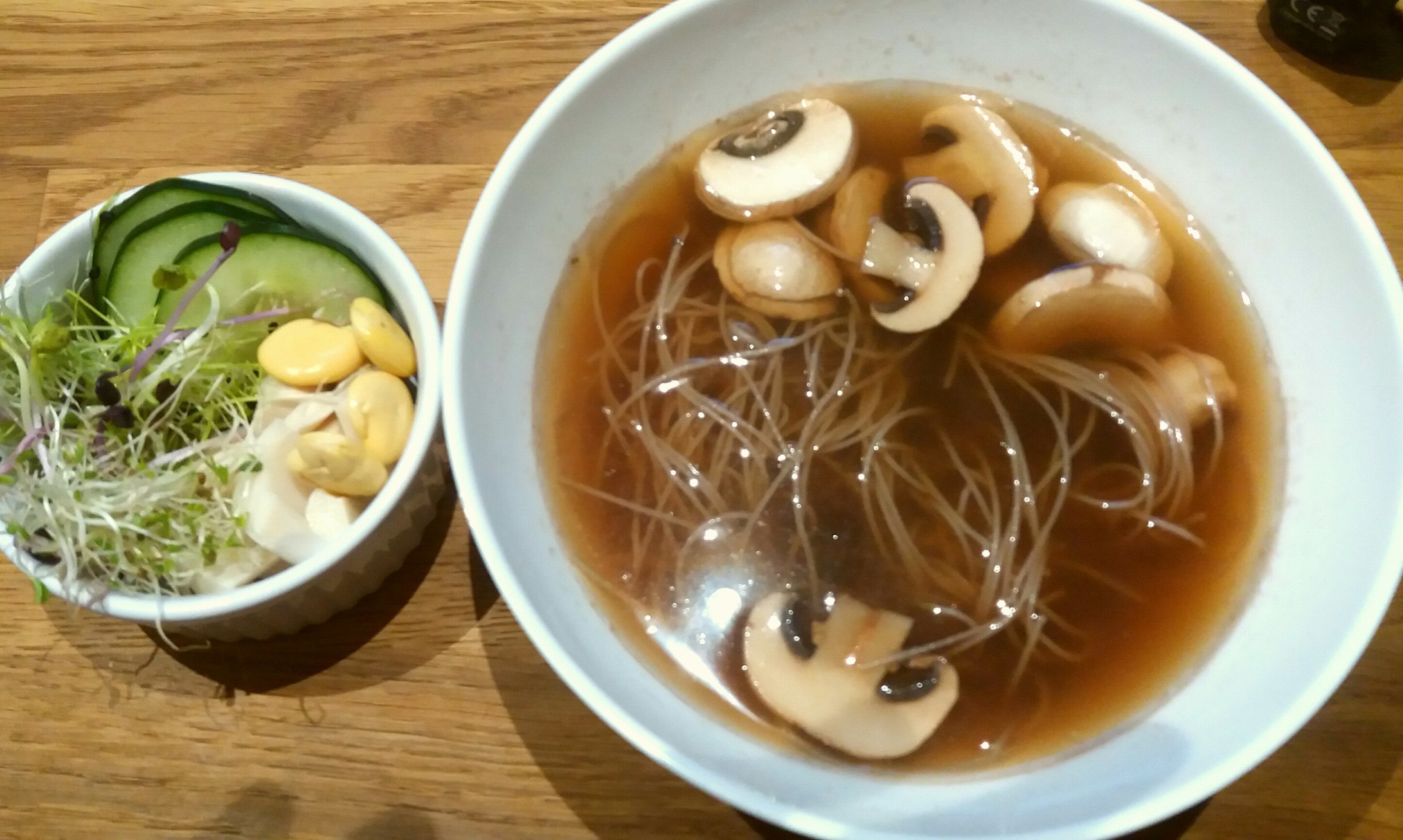 Le petit déjeuner de ce matin. Des crudités et un bouillon pho très épicé avec des nouilles de riz complet et des champignons