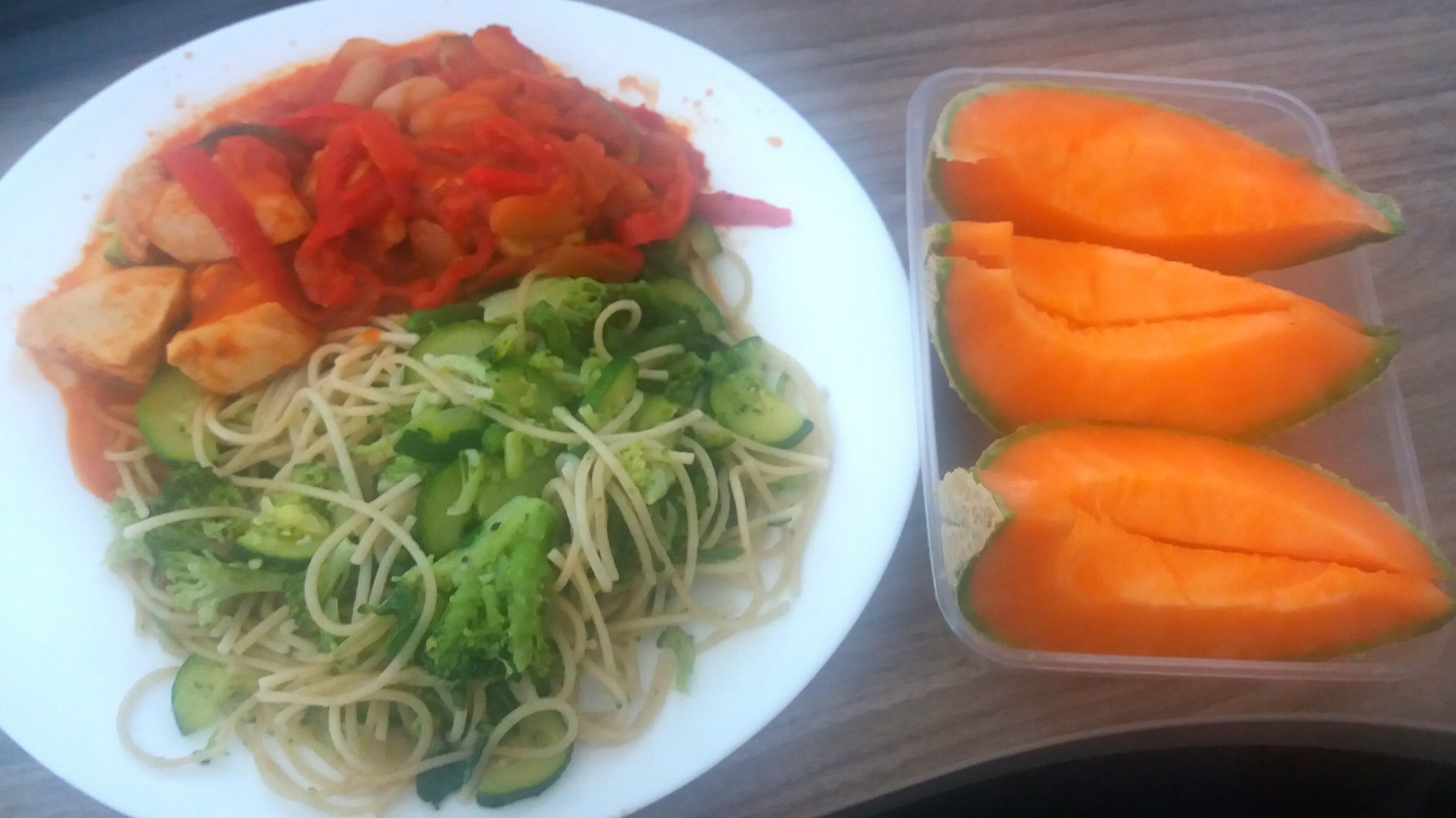 Ça reste un demi melon + beaucoup de pate et de poulet + beaucoup de légume