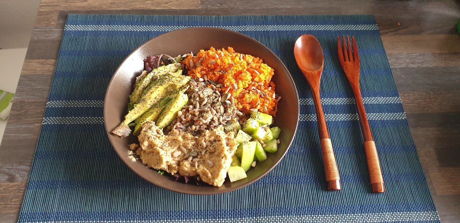 Petite salade simple quinoa/sarrasin/riz, carottes et chou rouge râpés, concombre, avocat, houmous